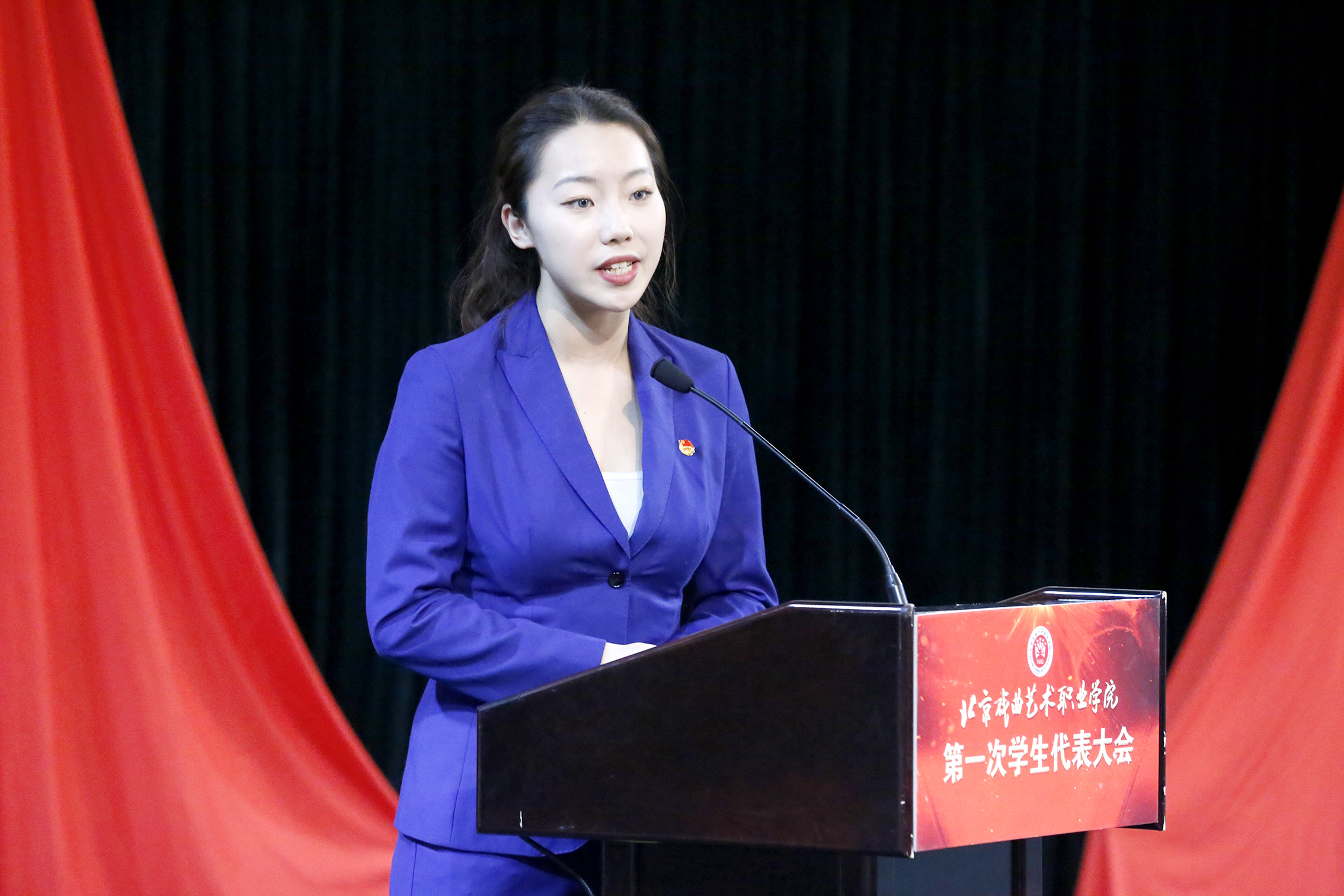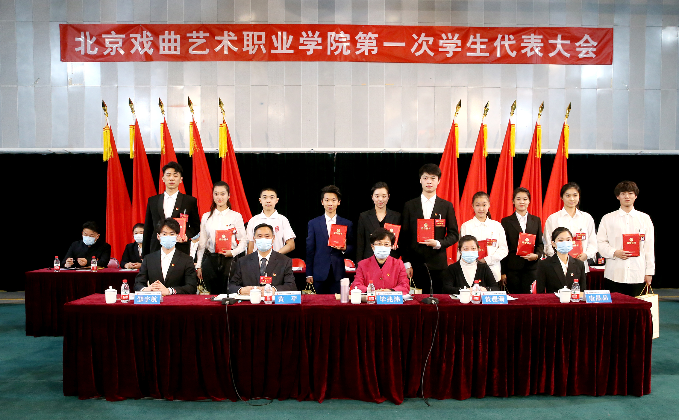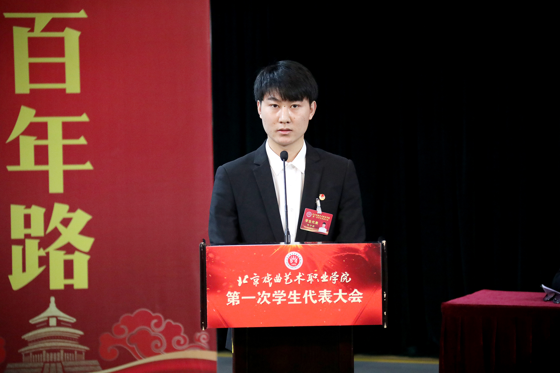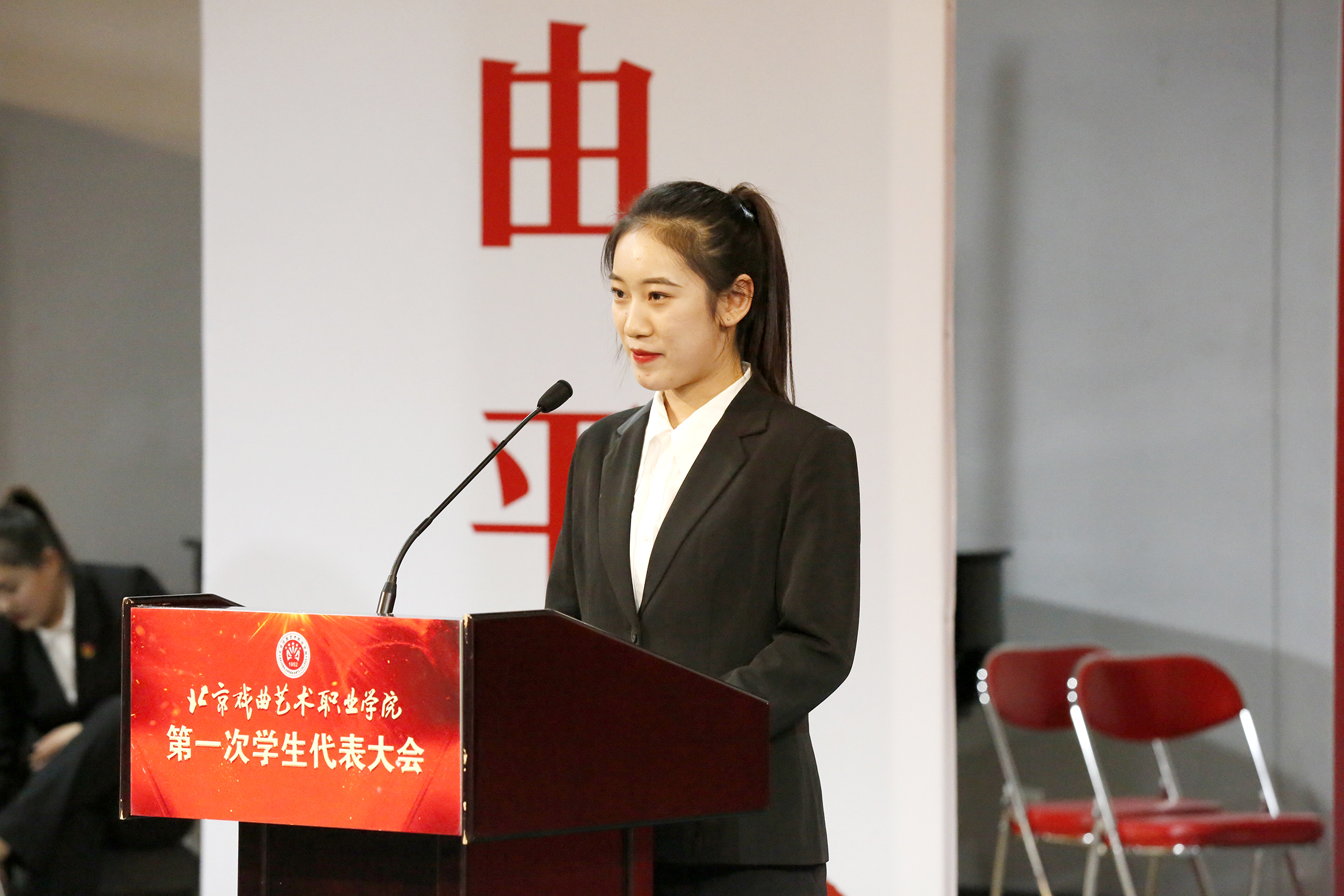 学院党委副书记黄平宣布第一届学生代表大会学生委员会当选委员:高职舞美技师2021班王艳艳、高职京音2020班赵一曈、高职影视2020班铁琪格、高职曲艺2020班高鑫、中专中国舞2017班刘品仪、中专京表2017班余佳诺、中专评剧2019班秦岳阳。第一届学生会主席团当选主席:高职形体2021班张晓悦、高职曲艺2020班陈荣强、高职影视2021班张艾佳、中专京音2020班张国放、中专音乐2017班高瑜遥。