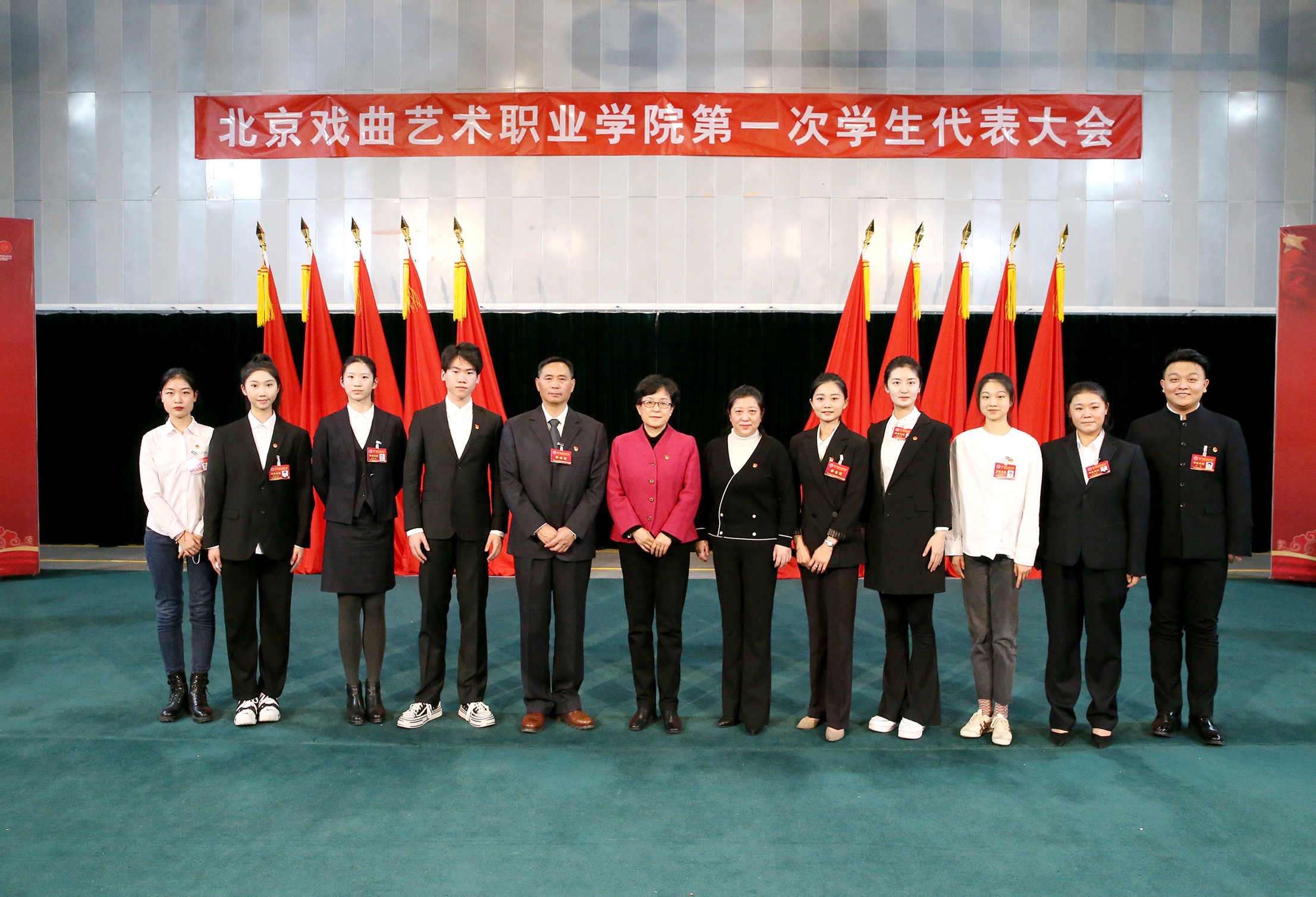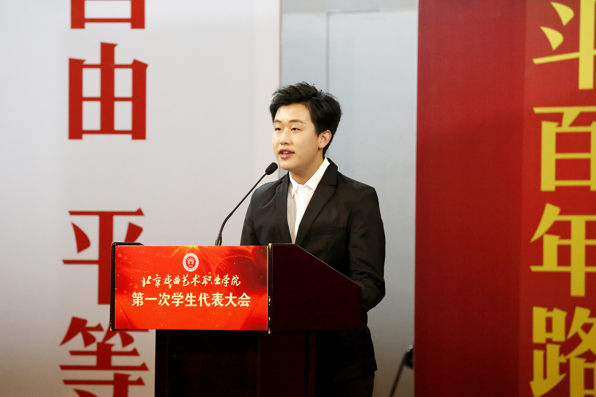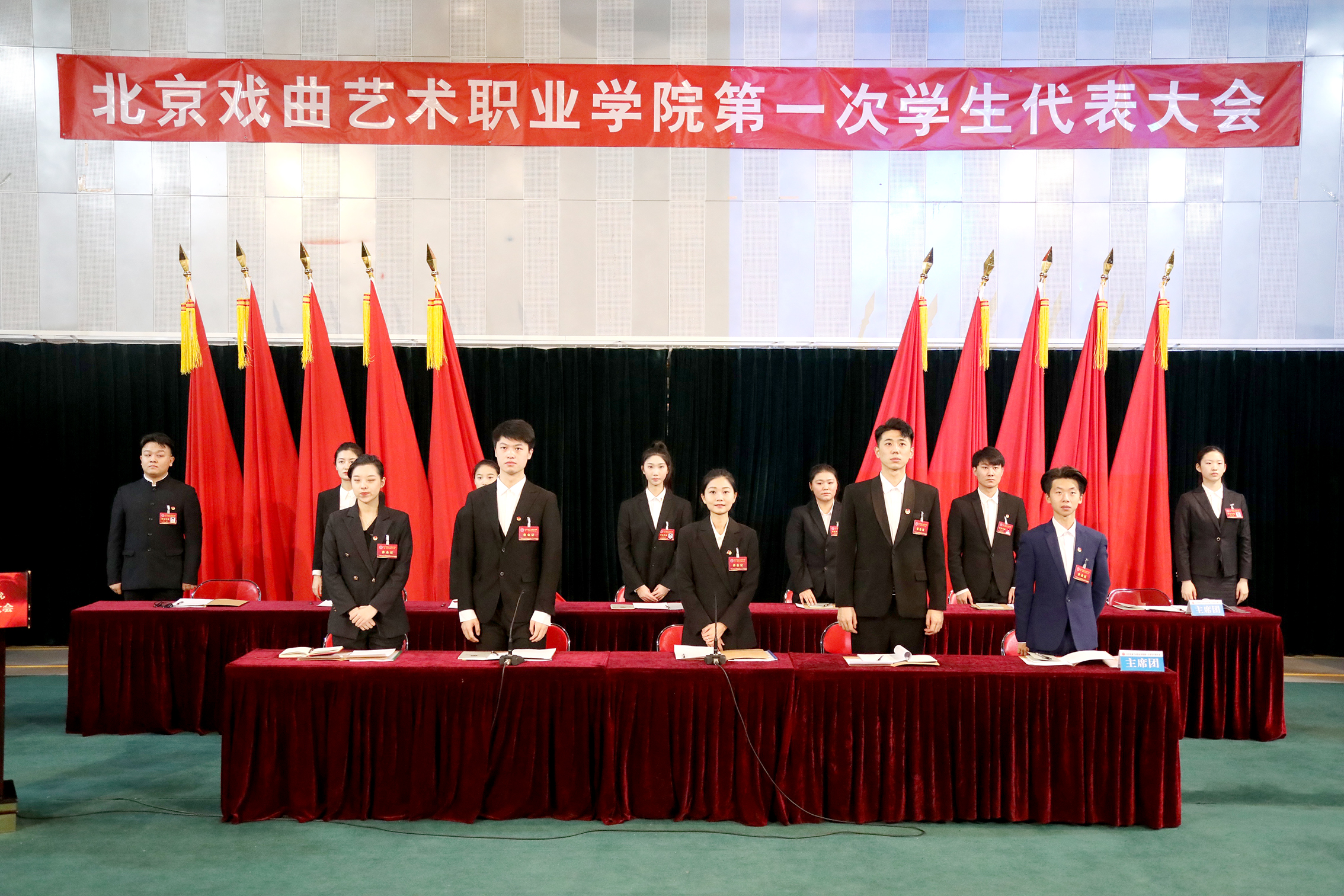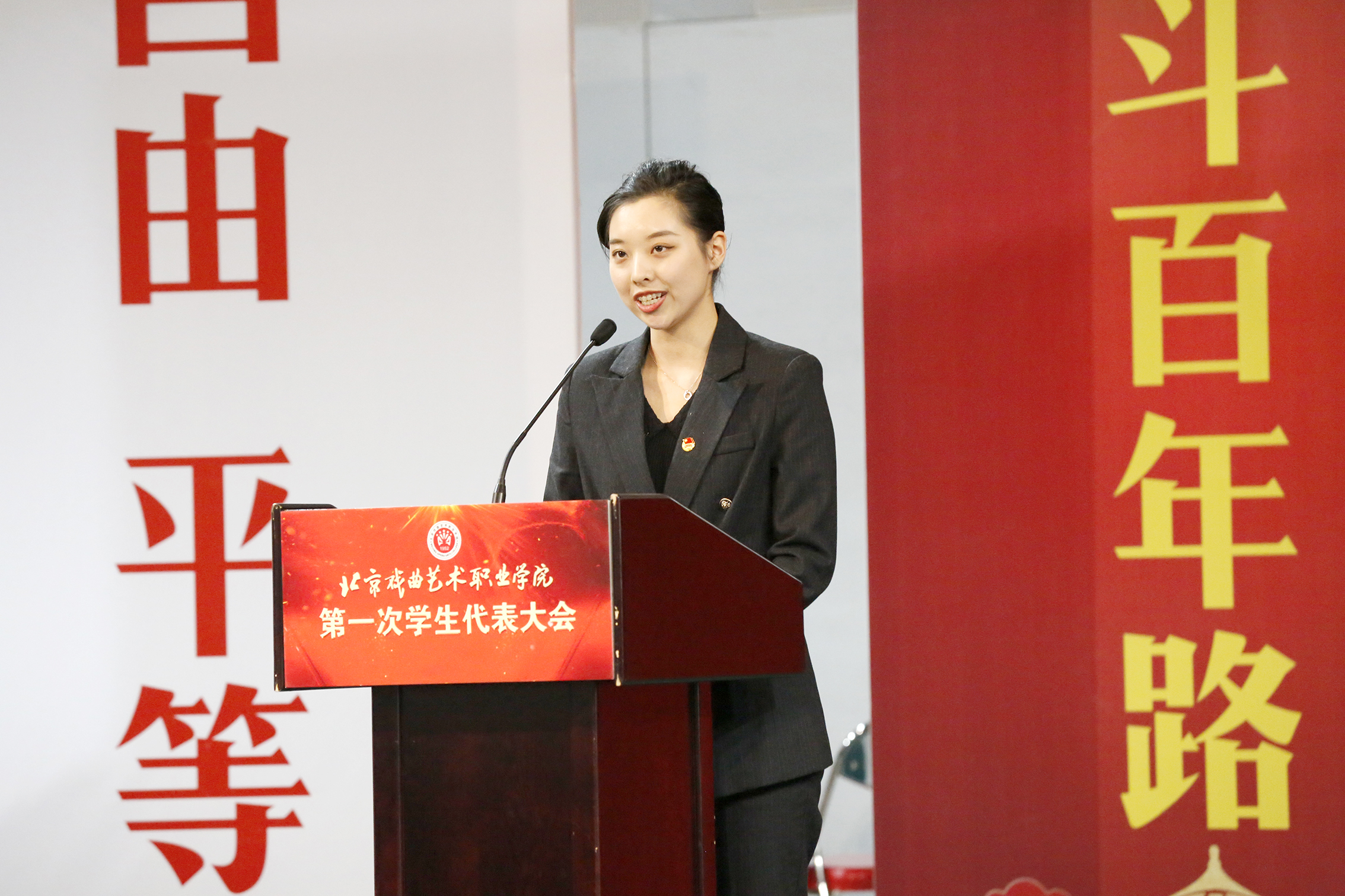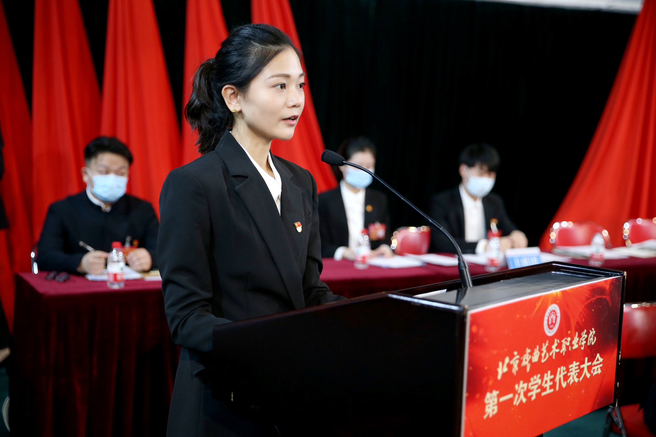 学院党委副书记黄平宣布第一届学生代表大会学生委员会当选委员:高职舞美技师2021班王艳艳、高职京音2020班赵一曈、高职影视2020班铁琪格、高职曲艺2020班高鑫、中专中国舞2017班刘品仪、中专京表2017班余佳诺、中专评剧2019班秦岳阳。第一届学生会主席团当选主席:高职形体2021班张晓悦、高职曲艺2020班陈荣强、高职影视2021班张艾佳、中专京音2020班张国放、中专音乐2017班高瑜遥。