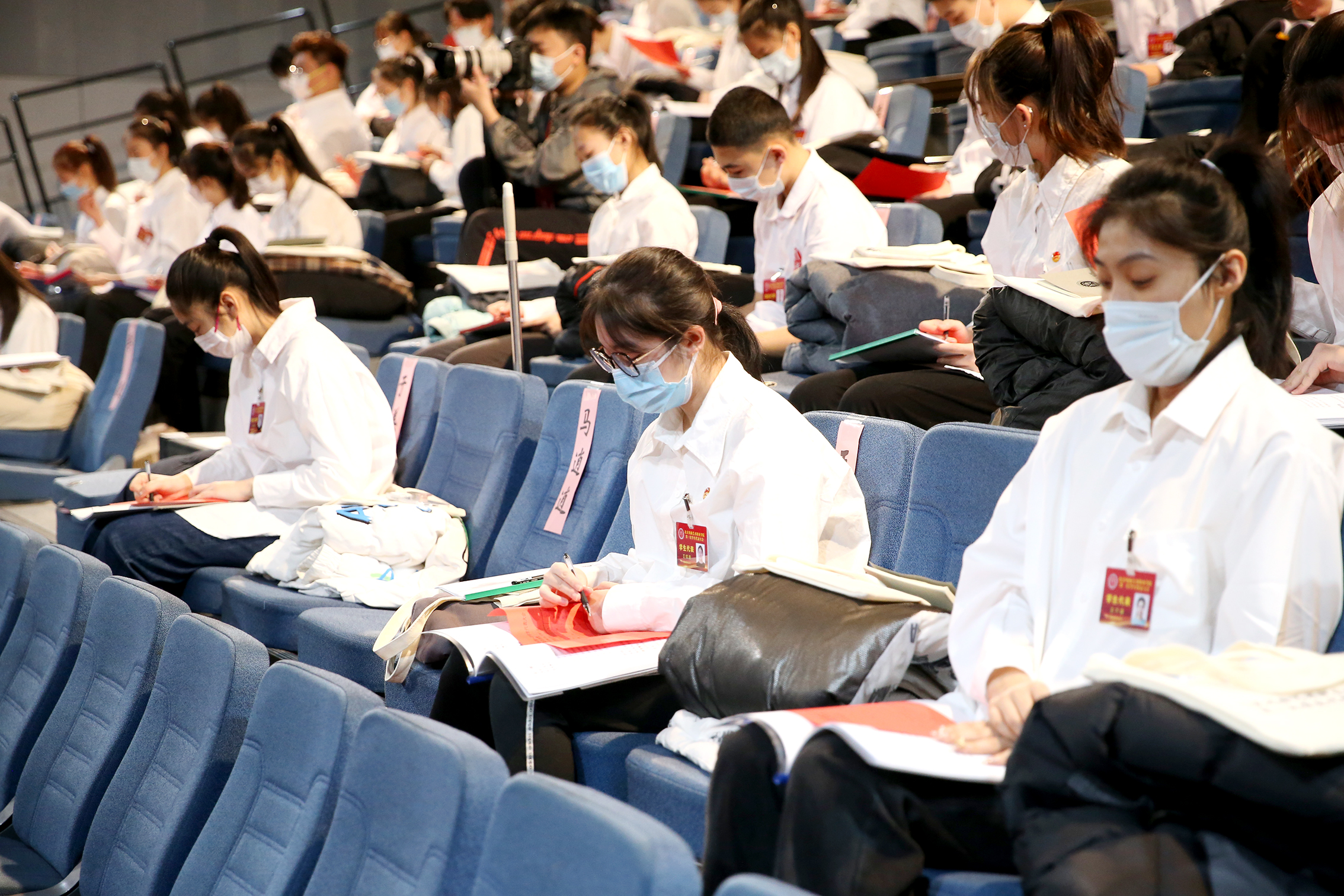 大会主席团成员高职影视2020班铁琪格同学向大会作提案工作报告。