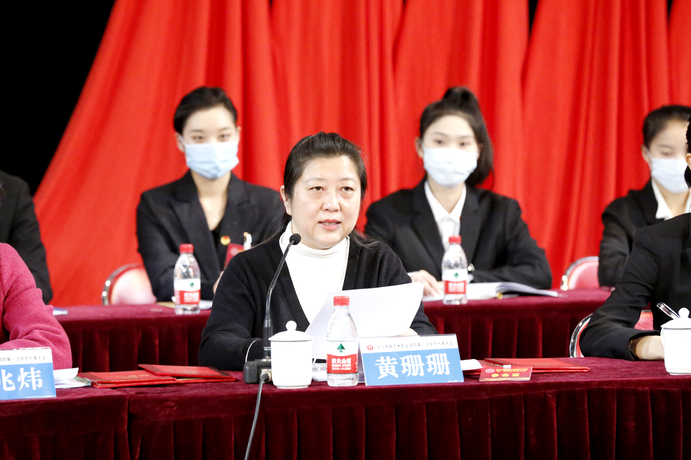 院长黄珊珊亲切致辞,代表学院向大会表示热烈祝贺,对学生会组织及各位学生干部表示衷心的感谢。她向各位代表、同学、老师们提出三点希望:一是希望学生代表大会特别是学生会凝心聚力,守正创新,当好桥梁纽带。二是希望各位代表、学生干部勇于担责,真抓实干,争做先锋模范。三是希望学生会组织严格落实高校学生会深化改革的各项要求,不断加强自身建设。