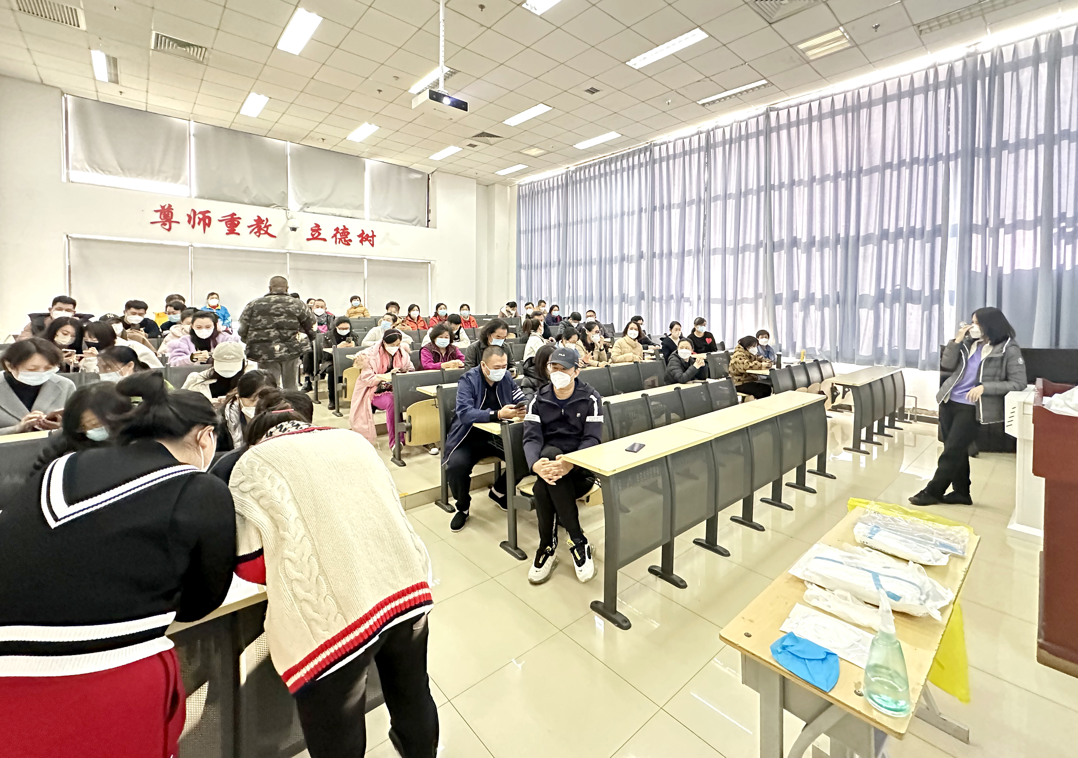学院实行封闭式管理,学院党员干部24小时在校值班值守,与学生同吃同住,积极主动做好学生的思想引导和心理疏导工作。他们引导和维持秩序,一次次耐心提醒“请戴好口罩”,一遍遍耐心提醒“请保持一米间隔”最大程度保证核酸检测速度和进度;他们日以继夜,奔走在校园各个角落管控人员流动、协调防疫物资搬运、参与环境消杀;他们舍“小家”、顾“大家”,加班加点、争分夺秒在信息摸排、核酸检测、心理疏导等工作。广大党员、教师主动作为、勇于担当,他们用敢于当先、无私无畏、甘于奉献的精神守护师生的健康,以实际行动为坚决打赢疫情防控歼灭战贡献力量。
