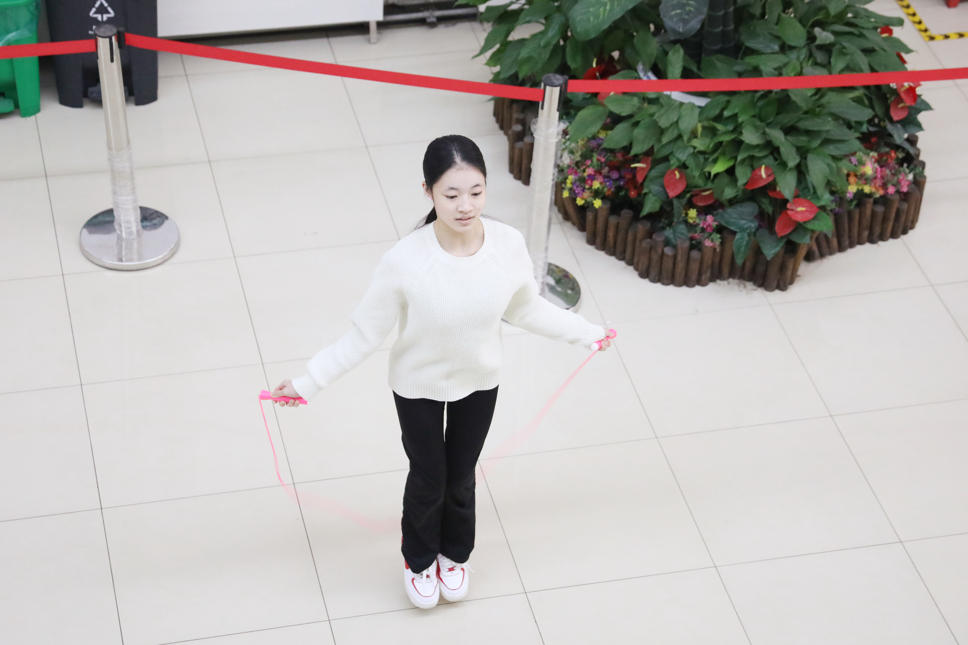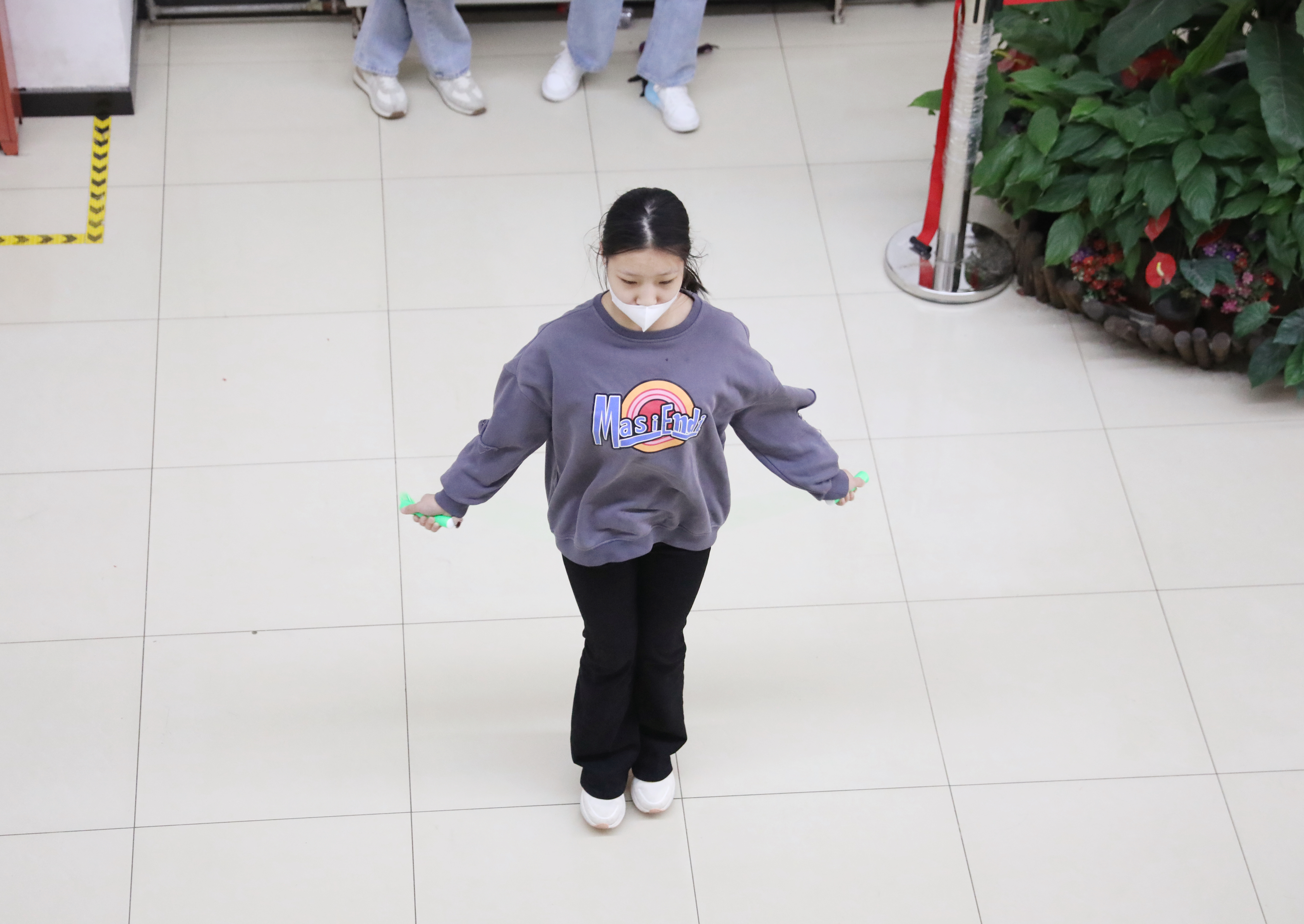 单人跳绳决赛中,绳子翻飞,只见掠过的虚影,参赛同学们以自己各不相同的跳法快速跳动着,展示出了稳健与速度的美感。