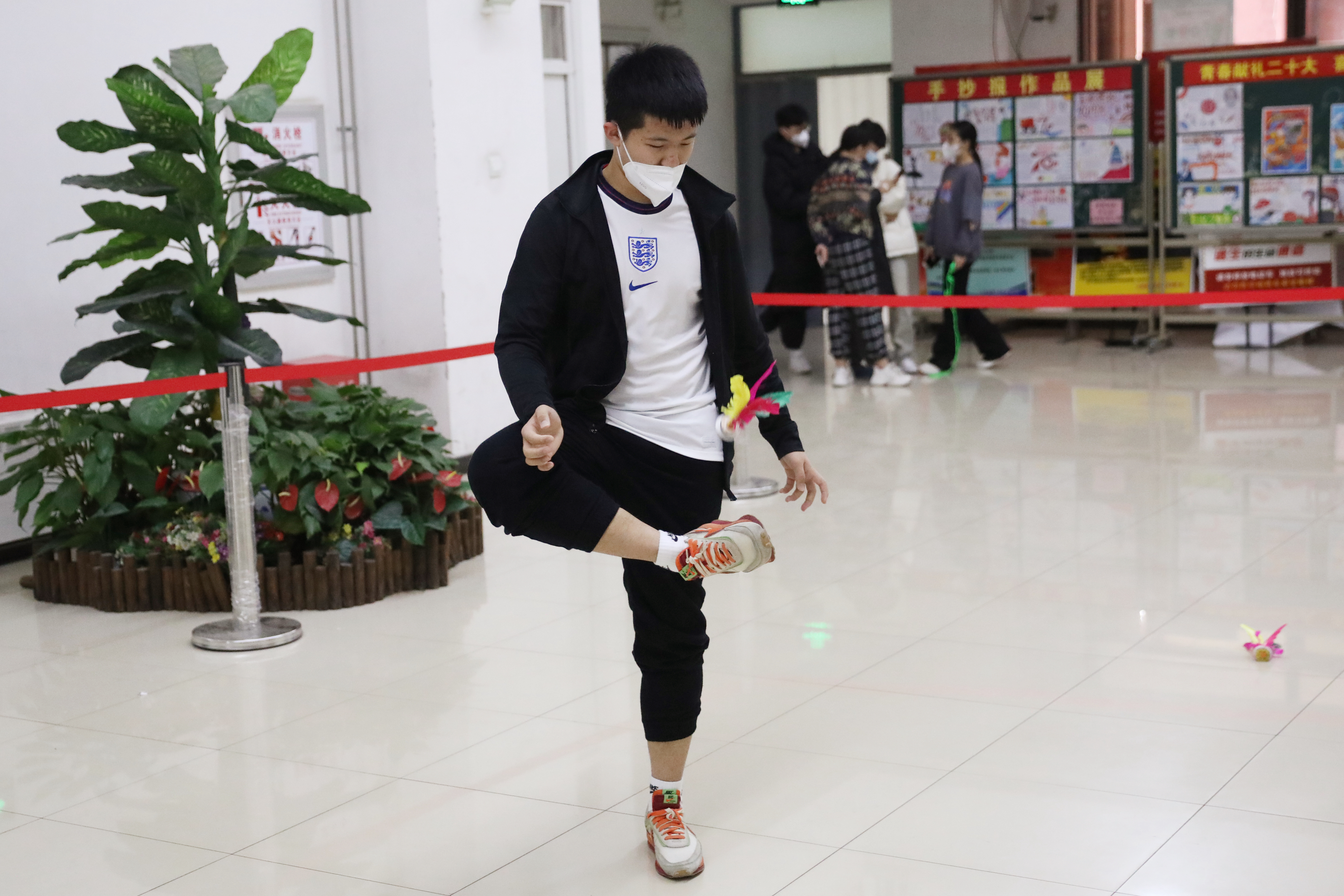 单人踢毽子决赛中,参赛同学身轻如燕,彩色的羽毛毽在空中上下跃动,一起一落间,令人叹为观止。