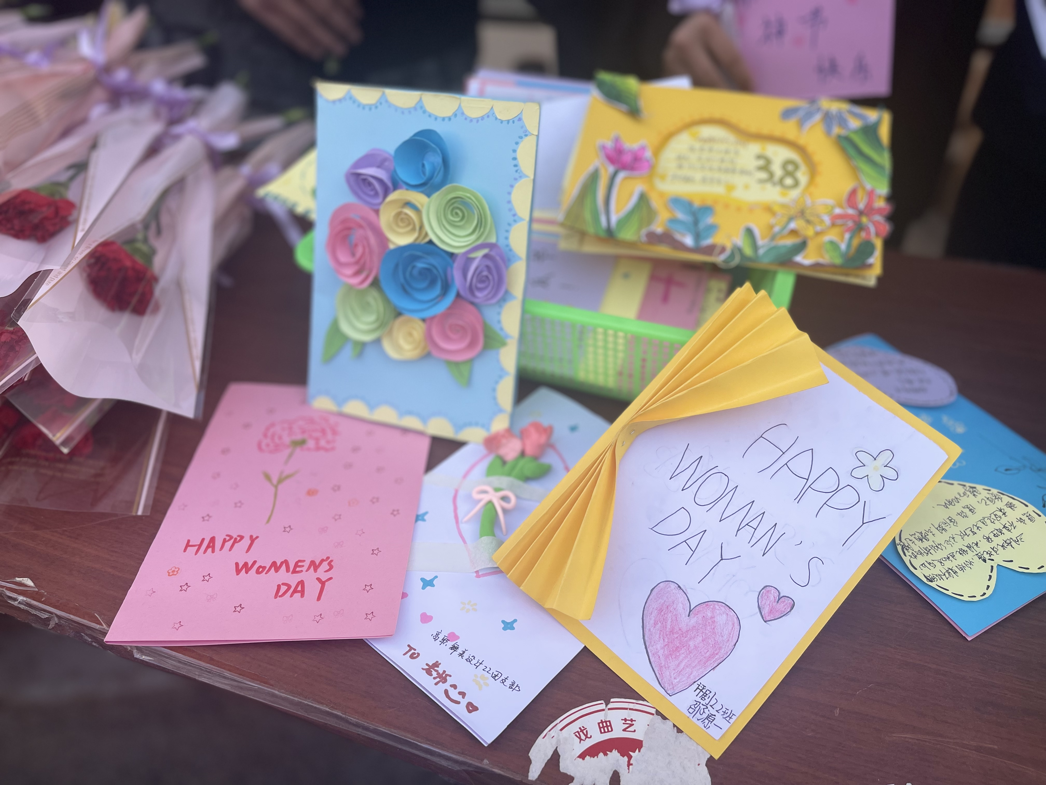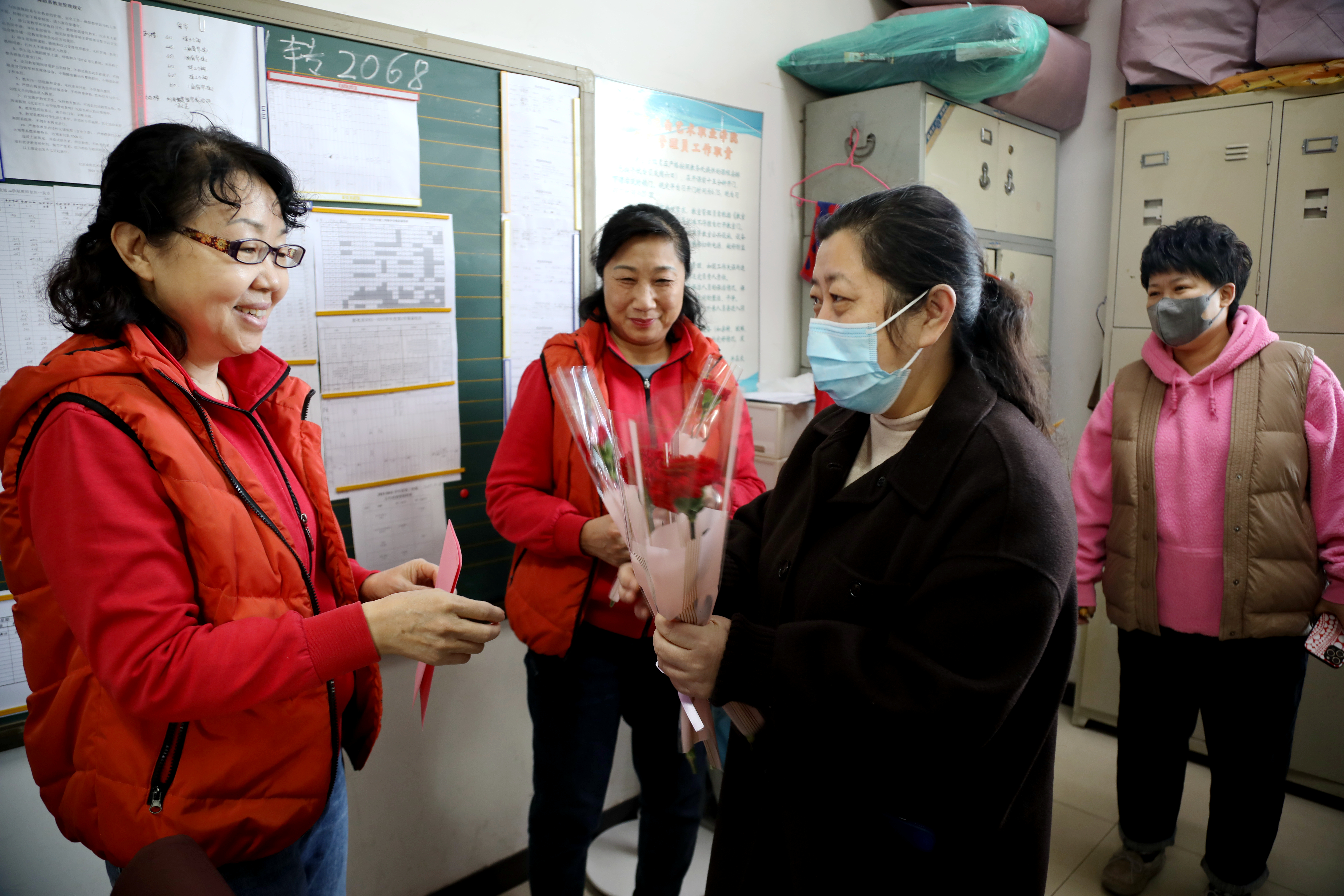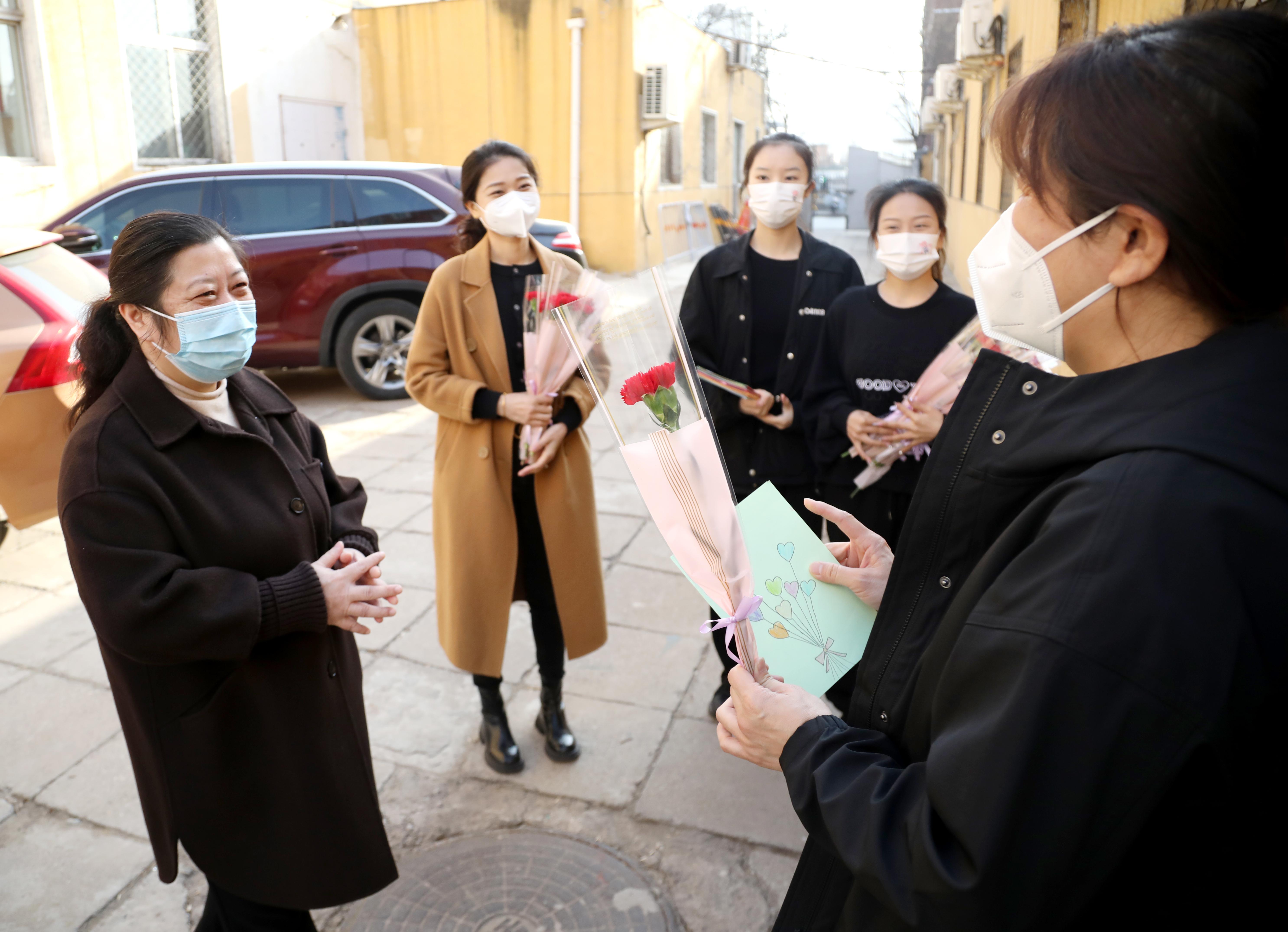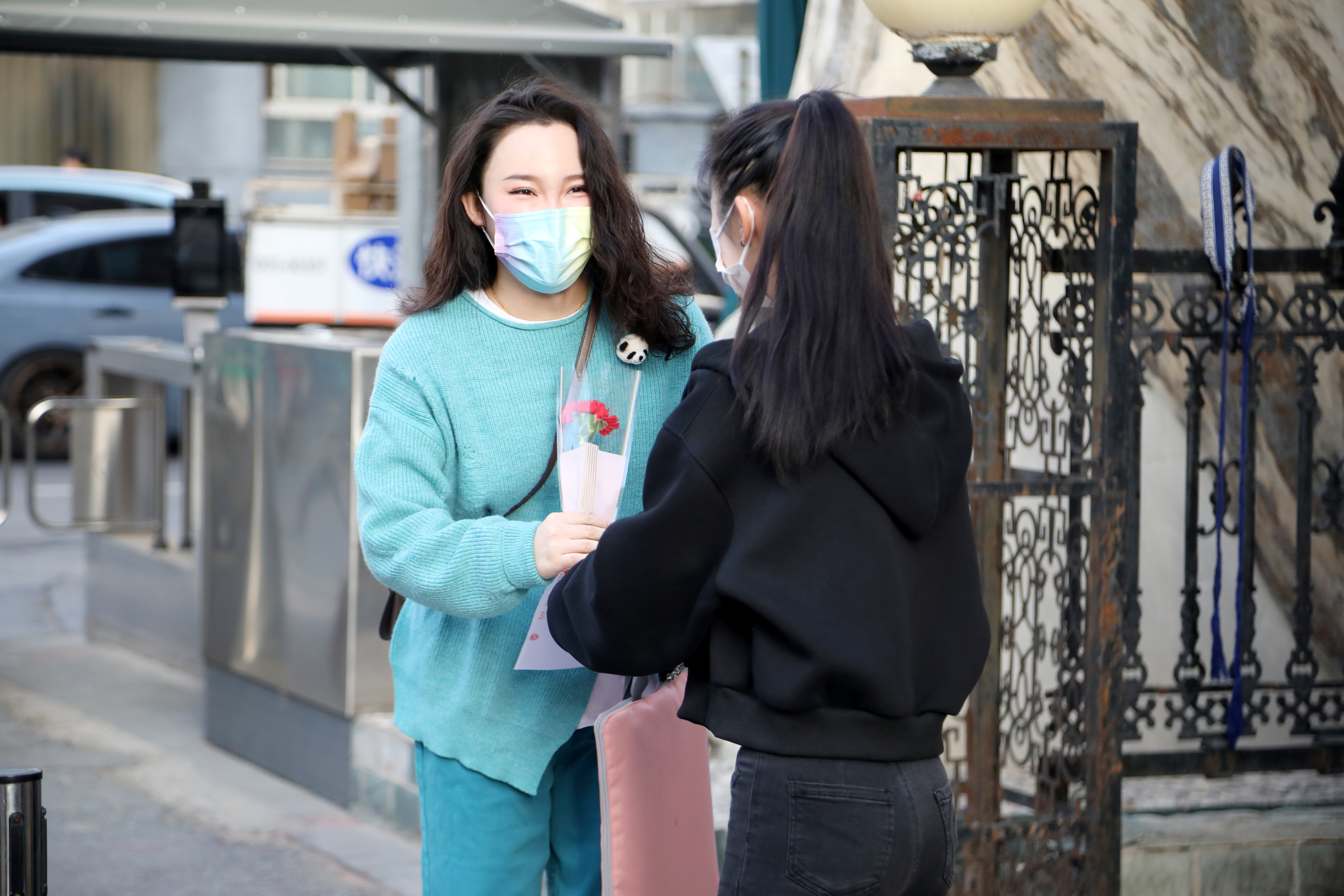 3月8日8点,学院党委书记黄珊珊,工会委员王静、陈明,团委书记唐晶晶和学生志愿者一起在学院门口迎候前来上班的女老师,为她们送上一束带着晨露的康乃馨和一张孩子们亲手绘制的手工贺卡,祝福大家节日快乐,感谢她们为学院的辛勤工作与无私付出。