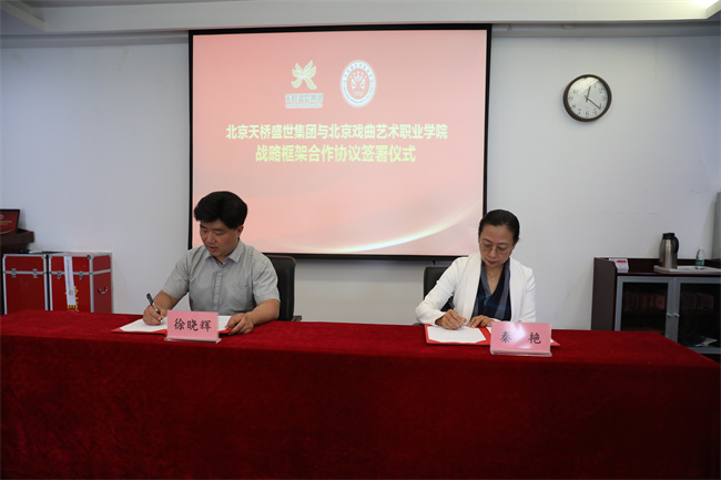学院与北京天桥盛世投资集团前期经多次调研交流,达成进一步深化合作意向。双方将致力于围绕校企合作交流,在人才培养、实习实训基地建设、演艺空间合作、品牌建设、艺术创作、原创剧目等方面开展深入合作。本次签订协议后将从顶层设计及战略层面共同合作,充分发挥各自领域优势,共同致力于推动双方共同发展,实现双方共赢的目标,为首都文化艺术事业的发展做出积极贡献。