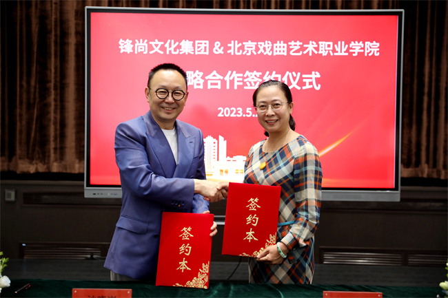 为贯彻落实党的二十大精神,服务首都发展大局,推动文旅融合,深化校企合作,5月22日下午,北京戏曲艺术职业学院与锋尚文化集团在北京歌华大厦举行战略合作签约仪式。北京戏曲艺术职业学院院长秦艳和锋尚文化集团董事长沙晓岚分别代表双方签署战略合作协议。签约仪式由锋尚文化集团副总裁杨学红主持。北京戏曲艺术职业学院和锋尚文化集团相关部门负责人及工作人员参加签约仪式。