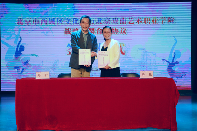 下午,学院院长、党委副书记秦艳与北京市西城区文化馆馆长郑昕共同出席双方携手举办的“五月鲜花 炫舞未来”彩虹剧场舞蹈聚会,并代表签署战略合作协议。相关部门负责人、工作人员及观演市民共同见证签约。