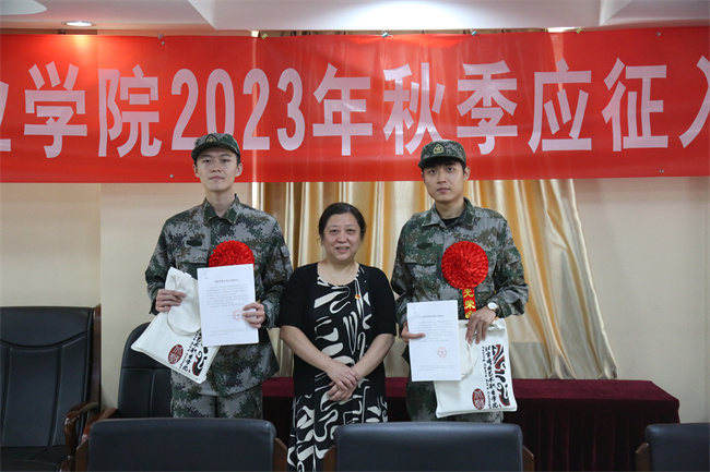 学院院长秦艳、副院长焦振宇与两名预定新兵合影