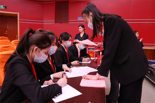 代表们根据学生委员的简历及学生会主席团候选人竞选的演讲和回答,认真填写好选票,郑重而有序地将选票放入投票箱。