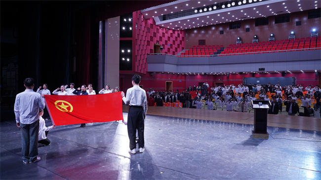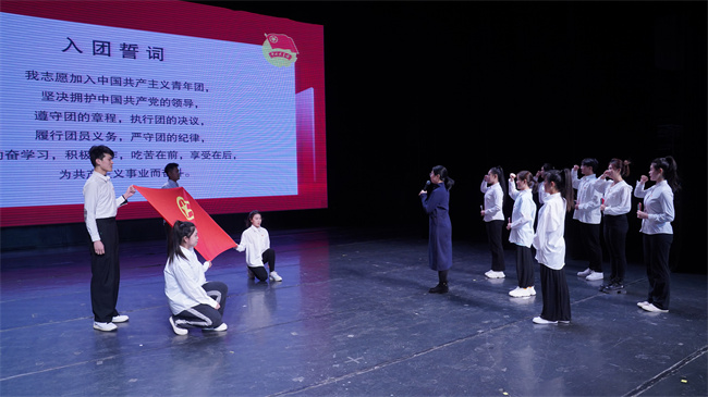 全体团员在学院团委委员、教职工团支部书记张艺佳老师带领下,面向团旗,举起右手,新团员进行庄严宣誓,老团员重温入团誓词。