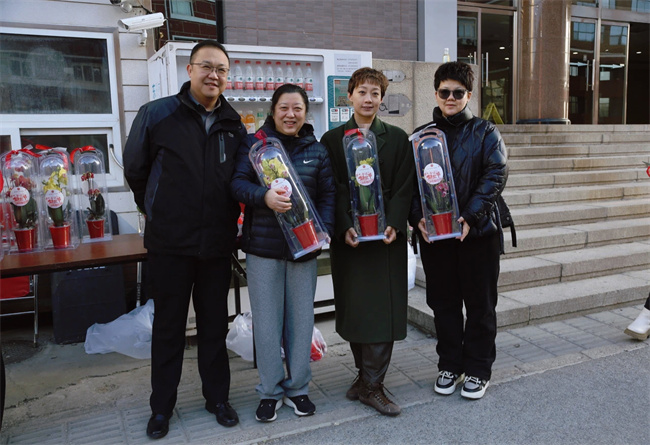3月8日7点30分,学院党委书记黄珊珊、副院长吴蕾、焦振宇、刁江辉及全体工会委员在学院门口为前来上班的女老师们送上了精心装点过的蝴蝶兰,并跟老师们合影留念,祝福大家节日快乐,感谢她们为学院的辛勤付出。一盆盆盛开的蝴蝶兰,宛如翻飞在花丛中的轻盈蝴蝶,象征着女性的清新、优雅、美丽、幸福,既装扮了环境,也装点了春天,扮靓了整个校园。