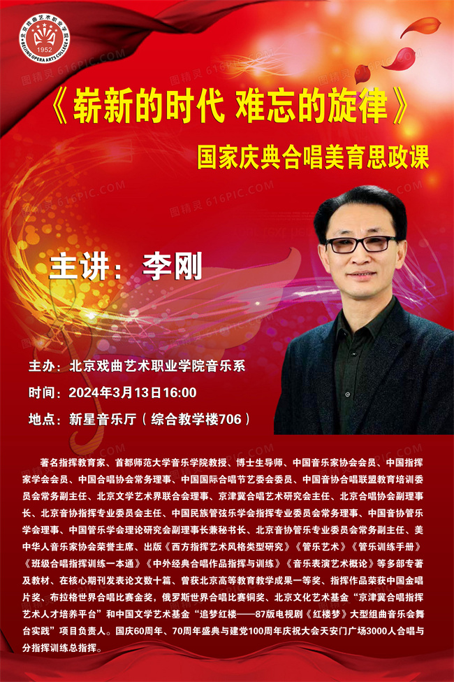 2024年3月13日,北京戏曲艺术职业学院音乐系邀请著名指挥教育家,首都师范大学音乐学院博士生导师李刚教授在新星音乐厅举办了一场别开生面的国家庆典合唱美育思政课。这堂课以“崭新的时代,难忘的旋律”为主题,通过合唱的形式,让学生们在美育中接受思政教育。