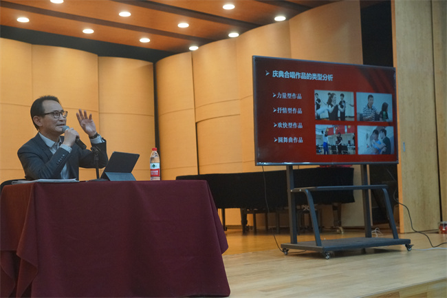 李刚教授通过详实的第一视角影像资料、大气磅礴的曲目演唱、合唱排练情景再现,深情回顾了广场分指挥团队招募选拔、封闭集训、片区合练、千人合练、全要素合练等各个阶段的排演过程,揭秘了庆典背后鲜为人知的动人故事。从“决胜第一拍”到“每天20000拍指挥技艺的锻造”再到“我们的国歌是最好的国歌”,李刚教授生动有力的叙述点燃了在场同学们的爱国热情与民族自豪。学生们在课堂上欣赏了很多振奋人心的合唱作品,《团结就是力量》、《唱支山歌给党听》、《我们走在大路上》,一首首具有时代精神的歌曲不仅展现了国家的繁荣昌盛,也传递了团结奋进的力量。