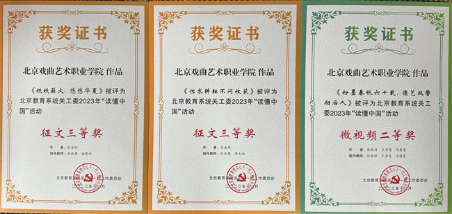 我院关工委秘书长万小丽老师、关工委委员屈淑琴老师以及老干部处冯慧慧老师参加了会议。我院关工委荣获“北京教育系统关工委2023年信息宣传工作先进单位”、“北京教育系统关工委2023年‘读懂中国’活动优秀组织奖”;我院舞美系舞美设计21班吴禹熙同学撰写的《但求耕耘不问收获》与影视系22级张紫彤同学撰写的《秩秩薪火,悠悠华夏》均被评为“读懂中国”活动征文三等奖;我院报送的微视频《粉墨春秋六十载,德艺双馨励后人》获“读懂中国”活动微视频二等奖;学院关工委冯慧慧荣获“北京教育系统关工委2023年信息宣传工作先进个人”。