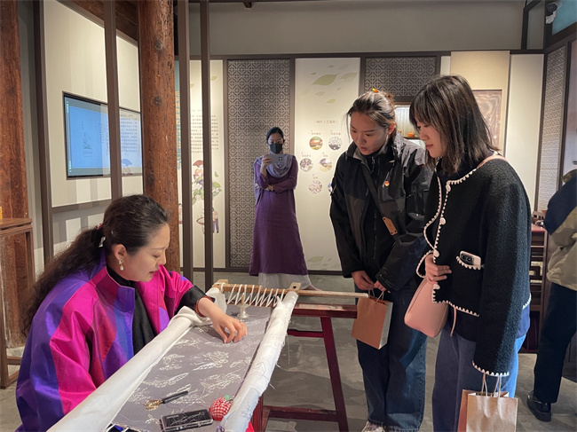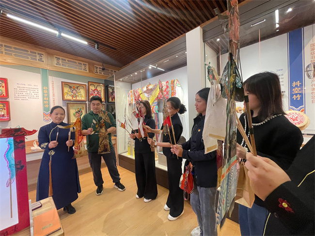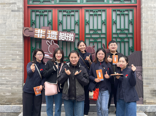 北京非遗体验中心(合园)位于沙井胡同,团员们在工作人员的讲解下深入宅院体验非遗项目,观看了非遗影片,体验了木版水印制作技艺、北京面人郎、京绣、烧麦制作技艺、北京皮影戏等老北京衣食住行等方面的非遗项目,对北京非遗发展历史及特色亮点有了更生动、更深入的了解。