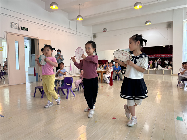 在戏曲知识讲解和戏曲形体表演教学环节中,小老师们通过“讲”“演”“学”“做”相结合的方式,使小朋友们了解了京剧的历史文化背景及基本知识,现场学习了“手、眼、身、法、步”京剧的基本表现手法,在和小老师们的互动中,边学边演边唱,进一步体验了京腔京韵。除了学唱京剧,小朋友们还学习了团扇身训组合,团扇是戏曲剧目中的常见道具,通过这些动作的组合,配合身段、可以衍化出各种舞姿,以表现人物情绪,刻画人物性格。小朋友们边学边感叹道,和舞蹈动作相比,这些动作更有难度,不同动作表达的情感也不一样。