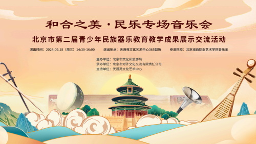 2024年9月18日,由北京市文化和旅游局主办、北京市对外文化交流有限责任公司承办、我院音乐系民乐教研室师生参演的“和合之美·民乐专场音乐会”暨北京市第二届青少年民族器乐教育教学成果展示交流活动社会公益演出在天通苑文化艺术中心上演并取得圆满成功。出席活动的领导有:北京市文化和旅游局科技教育处处长 呼建梅、北京市文化和旅游局科技教育处四级调研员 李宁、北京市对外文化交流有限责任公司总经理 路明。