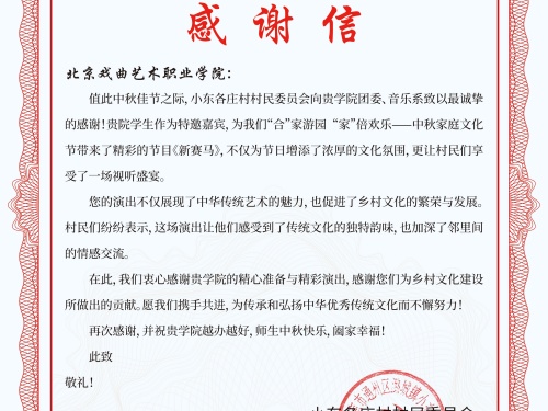 此次实践活动,收到了小东各庄村村民委员会的肯定。未来,团委将持续结合学院学生专业特色,扎实开展各类促进大学生就业活动,不断增强学生的演出实践能力,引领更多青年学生投身乡村振兴,为乡村艺术发展贡献自己的青春力量。