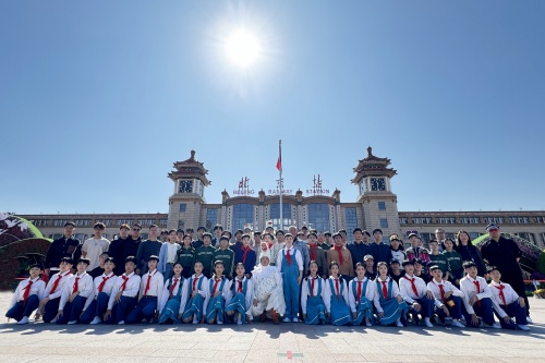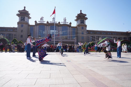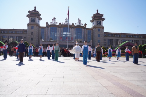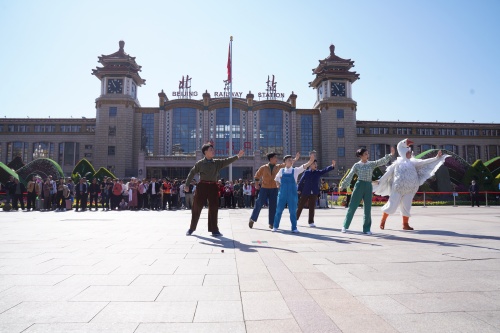 10月8日上午十时许,随着一阵悦耳清亮、节奏紧凑的京剧音乐伴奏声,北京站广场上,一群身着戏服的京剧演员们突然闪亮登场,飞脚、虎跳、小翻、圈旋子…一连串令人眼花缭乱、目不暇接的京剧表演技巧动作,一声声韵味十足、字正腔圆的京剧演唱,吸引了广场上的旅客们纷纷聚拢过来驻足观看。这群京剧演员们是来自北京戏曲艺术职业学院的师生。原来,广场上正在进行一场由北京戏曲艺术职业学院和北京市重点站区管委会联合策划的为庆祝中华人民共和国成立75周年和少先队建队75周年而举办的京剧“快闪”演出,演出的是新编京剧《心愿》的节选片段。