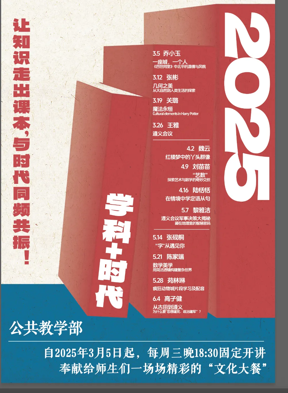 在信息爆炸的时代,如何让学子们既扎根文化土壤,又紧跟时代脉搏?在为理想奋斗的校园,如何让身处象牙塔的学生们在日常学习之外,能吸收到更多元的文化营养?公共教学部本学期以“学科+时代”为视角,纪念中国人民抗日战争暨世界反法西斯战争胜利80周年、遵义会议90周年,精心策划语文、数学、英语、政治、历史、地理等多学科系列讲座。2025年3月5日起,每周三晚18:30固定开讲,奉献给师生们一场场精彩的“文化大餐”。让知识走出课本,与时代同频共振。通过知识传授与热点解读的双向融合,为校园文化生活注入活力,助力学生人文素养提升,同时培养学生“家事国事天下事,事事关心”的格局与担当。
