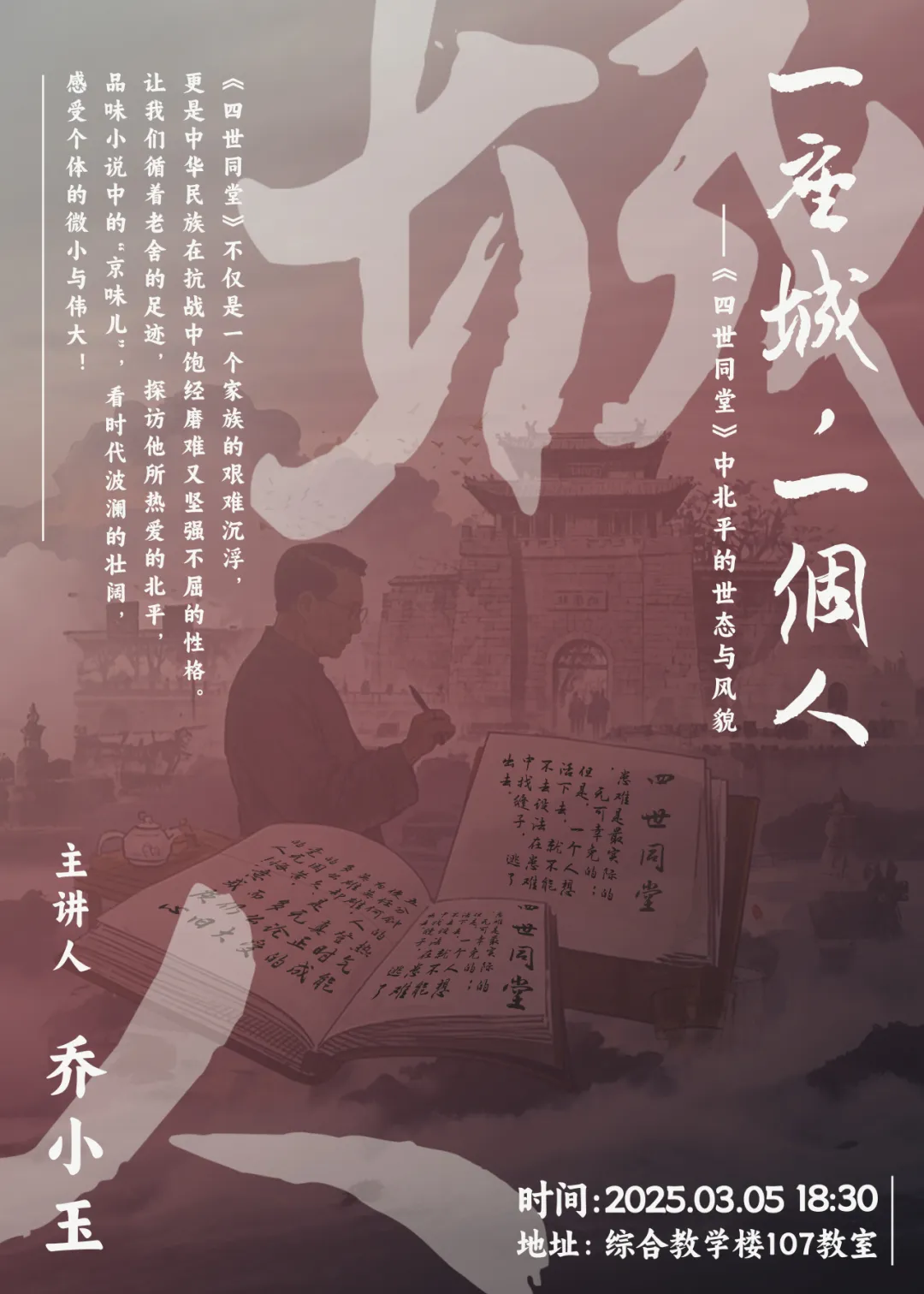 2025年3月5日将由公共教学部语文教师乔小玉为大家带来首场讲座,该场讲座聚焦作家老舍的经典著作《四世同堂》,通过走近老舍笔下的北平城与小羊圈胡同的芸芸众生,带领学生走进战火硝烟中的家国记忆,探寻“一个人与一座城”的血脉相连,从文学中读懂民族精神、北京文化与时代命题,感悟文学如何承载民族精神的重量。
