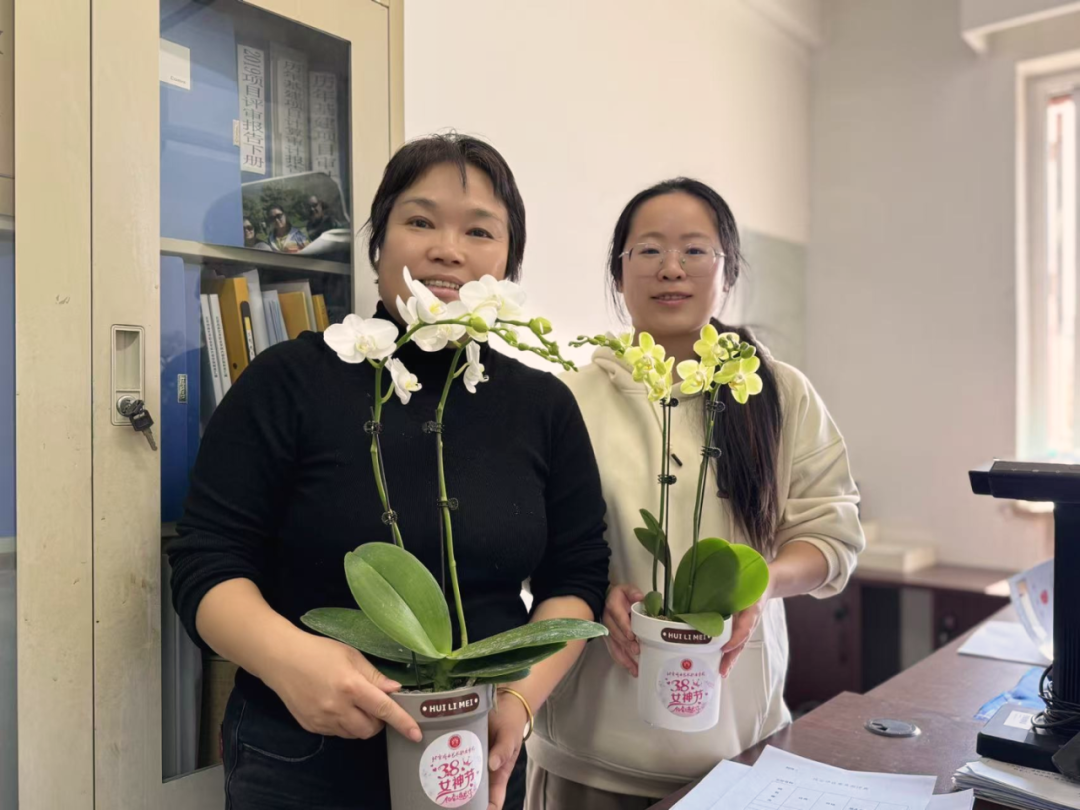 活动前一天,学院工会为每一位女性教职工精心准备了一盆蝴蝶兰花。蝴蝶兰以其优雅的姿态和长久的花期,象征着女性的坚韧、美丽与活力。中午12时,各部门教职工代表齐聚学院排演场大厅,有序领取鲜花。学院工会领导亲临现场,向全体女职工致以节日的祝贺,并对她们在学院发展中的辛勤付出表示衷心的感谢。