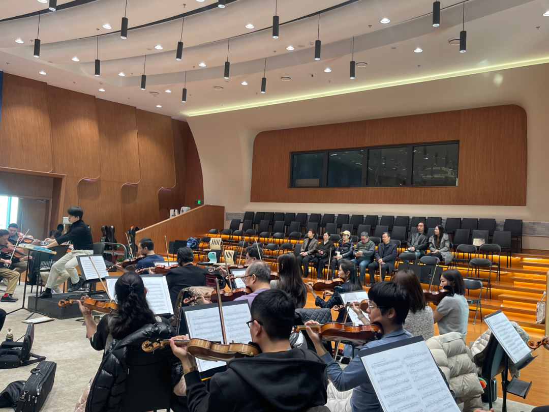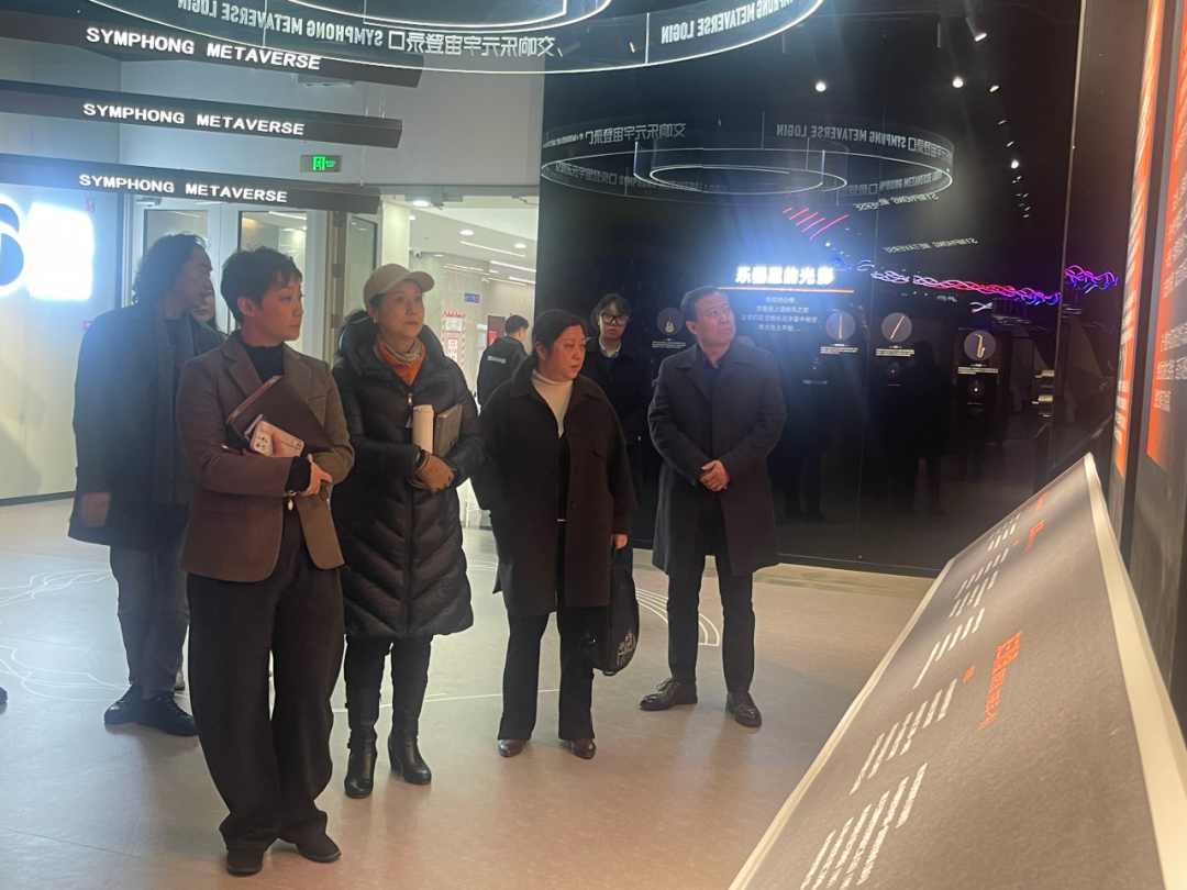在团长李长军陪同下,北戏团队实地考察了北京交响乐团新落成的现代化艺术空间。重点参观了少年交响乐团排练厅与声部训练室,详细了解"少交"在青少年艺术普及教育中的创新实践。在首都交响乐体验馆,通过全息投影、智能交互等前沿科技与古典音乐的深度融合,展现了北交在艺术传播数字化转型中的探索成果。
