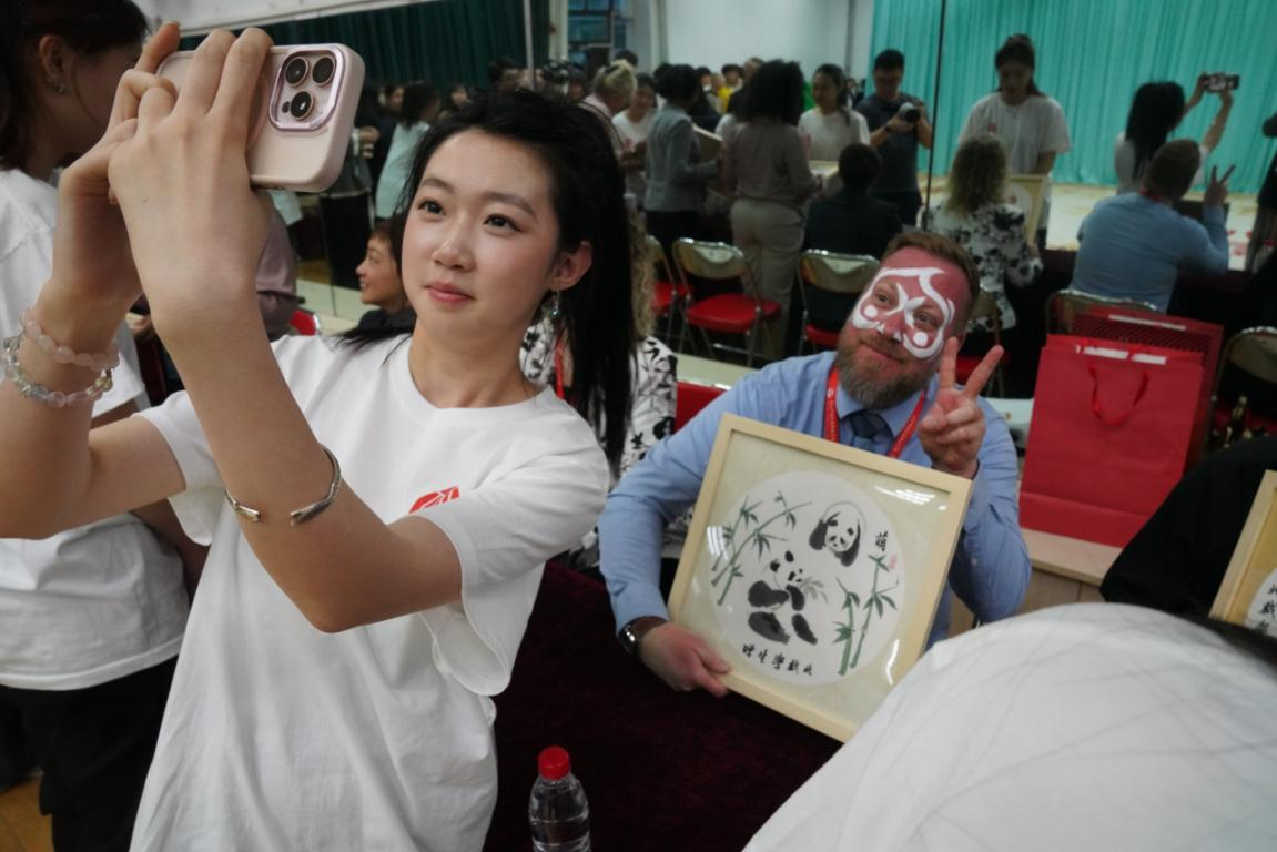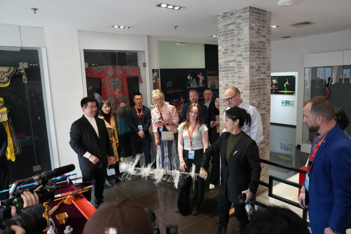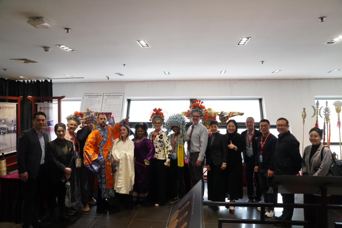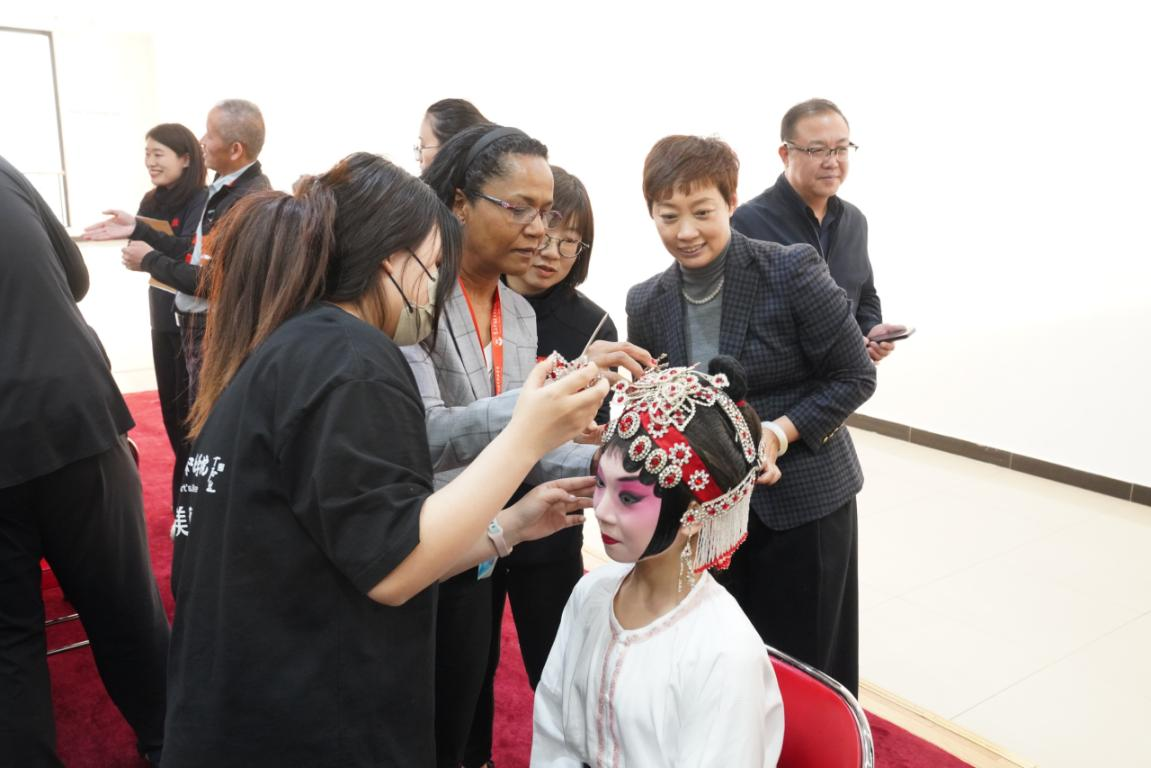 随后,校长团参观了少儿戏剧场,了解学院注重舞台实践教学的人才培养特色;三楼京剧展厅,在青年教师陈雷流利的英语讲解下,近距离参观了京剧服饰、乐器、道具并拍照打卡,感受京剧艺术的独特韵味;二楼容装展示区,亲身体验了京剧脸谱的绘制和头饰装扮,沉浸式领略戏曲魅力。
