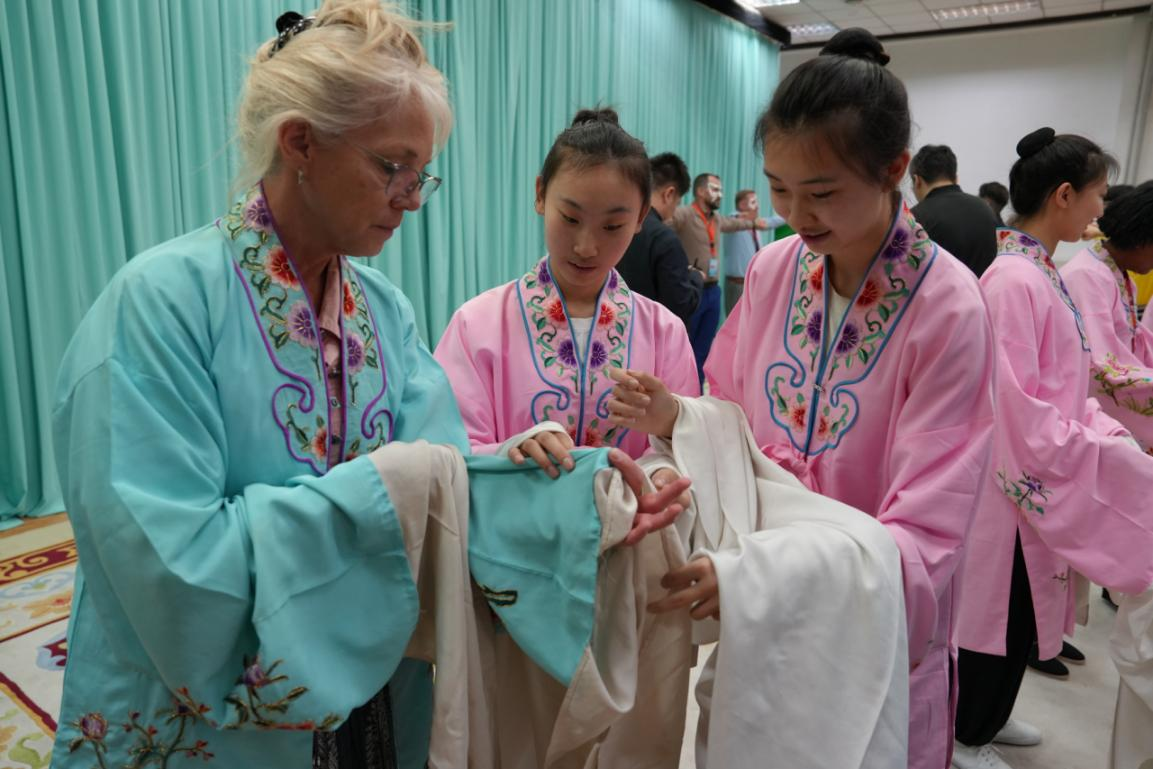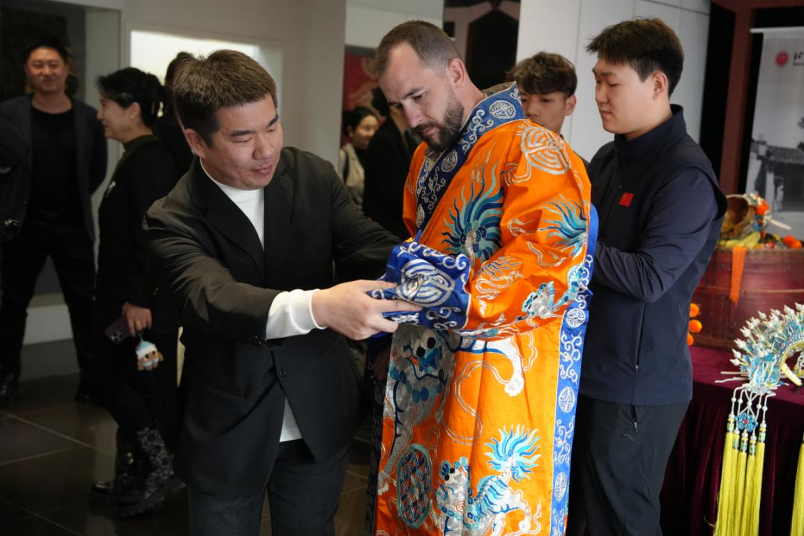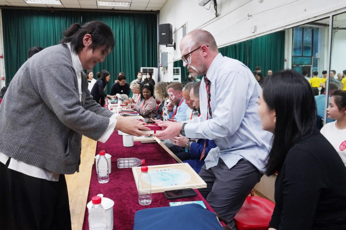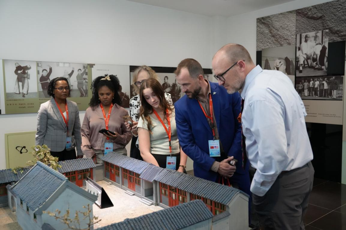 随后,校长团参观了少儿戏剧场,了解学院注重舞台实践教学的人才培养特色;三楼京剧展厅,在青年教师陈雷流利的英语讲解下,近距离参观了京剧服饰、乐器、道具并拍照打卡,感受京剧艺术的独特韵味;二楼容装展示区,亲身体验了京剧脸谱的绘制和头饰装扮,沉浸式领略戏曲魅力。