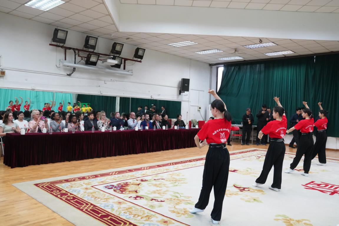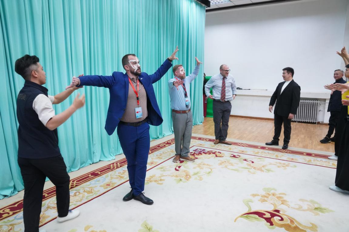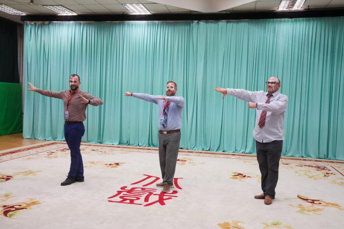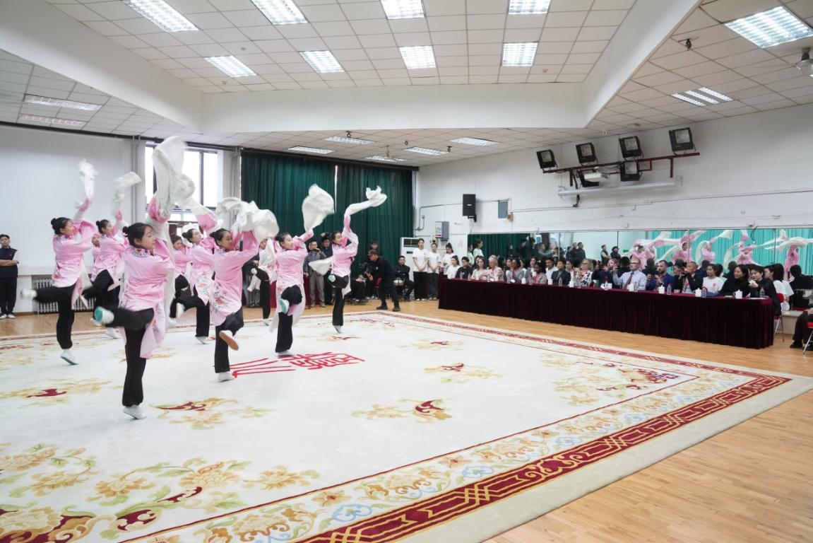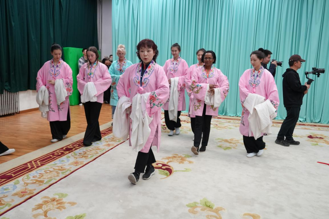 校长团在戏曲教学楼南一厅,走进京剧课堂,观摩体验戏曲教学。副院长许翠向代表团成员们介绍了我院京剧系的建设发展及人才培养模式、师资队伍力量。京剧系师生展示了京剧基本功、身段表演、唱腔示范等精彩的课堂教学内容。在互动环节,校长团成员们按男女分组参加京剧课堂教学体验,学习身段、水袖、念白等京剧表演动作和技巧,在一招一式、一唱一念之中,沉浸式感受戏曲艺术的教学特点和中华传统文化的独特魅力。
