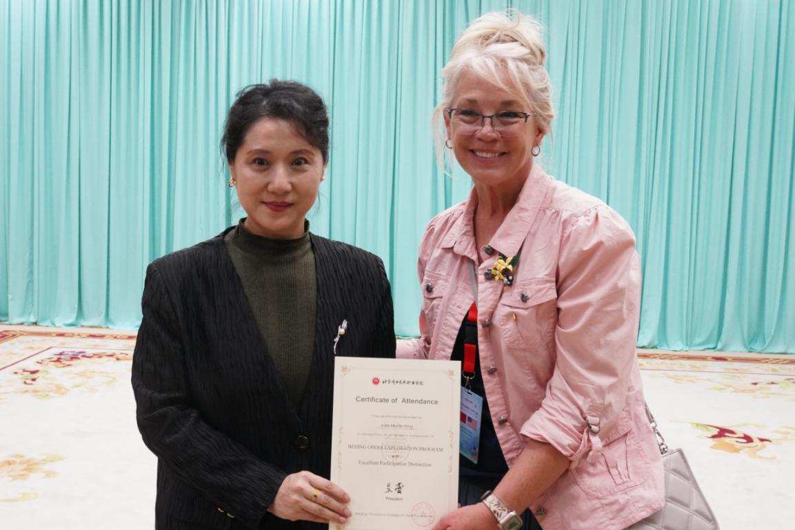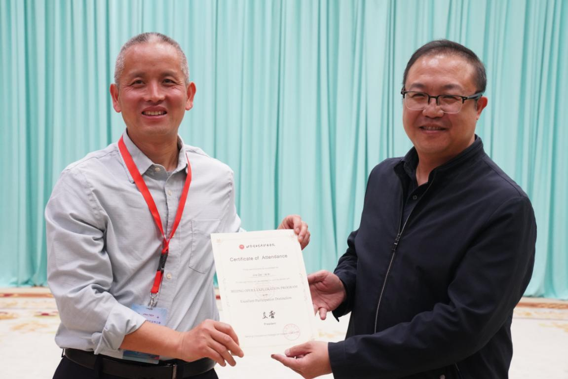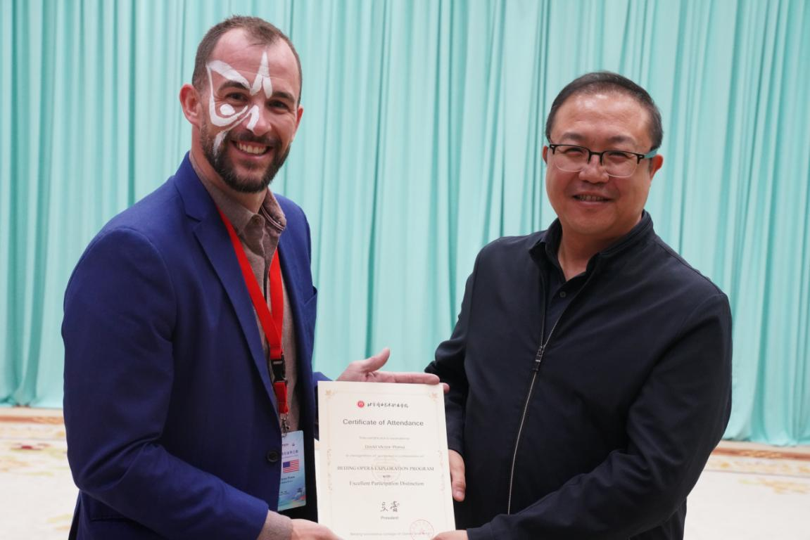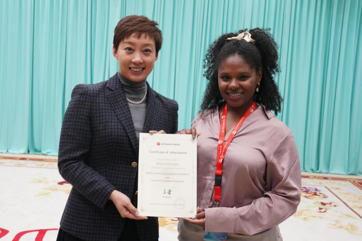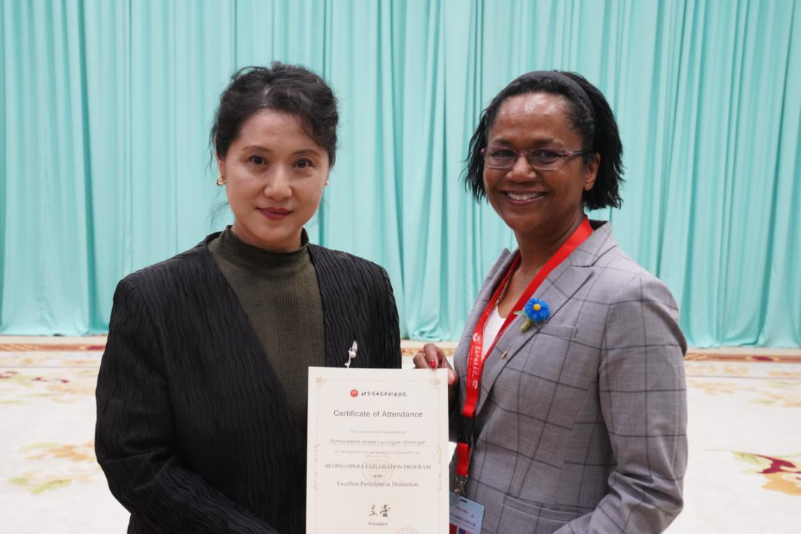 课堂观摩体验结束后,我院学生向美国友人赠送了精心制作的扇子、画作和非遗手工艺品“缠花”胸针,院长吴蕾、副院长许翠、副院长焦振宇分别为校长们颁发了戏曲文化探索印记证书。美国犹他州教育厅中文项目主任、校长团团长莲芯玫女士发言,对我院的热情接待致以衷心感谢,她指出,犹他州是全美开设汉语课程学校比例最高的州,很重视汉语和中国文化的学习,希望加强与北戏的友好交流,共同努力推动中美在教育文化领域的往来。