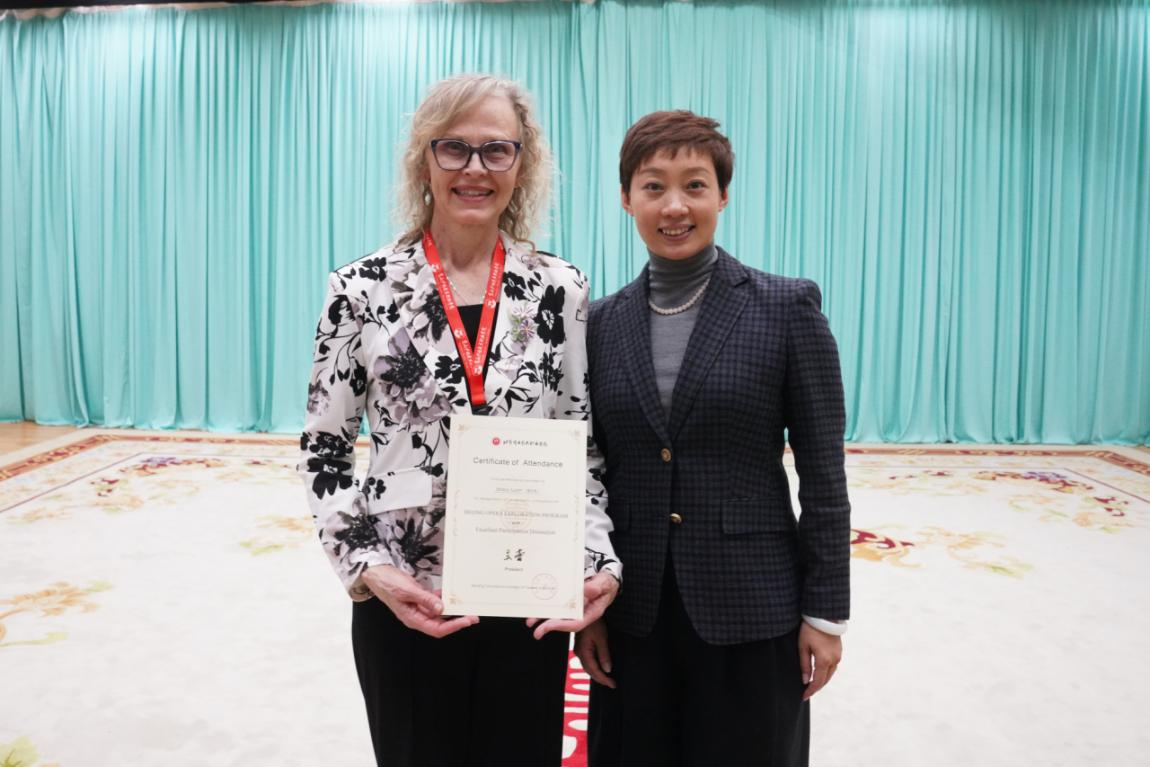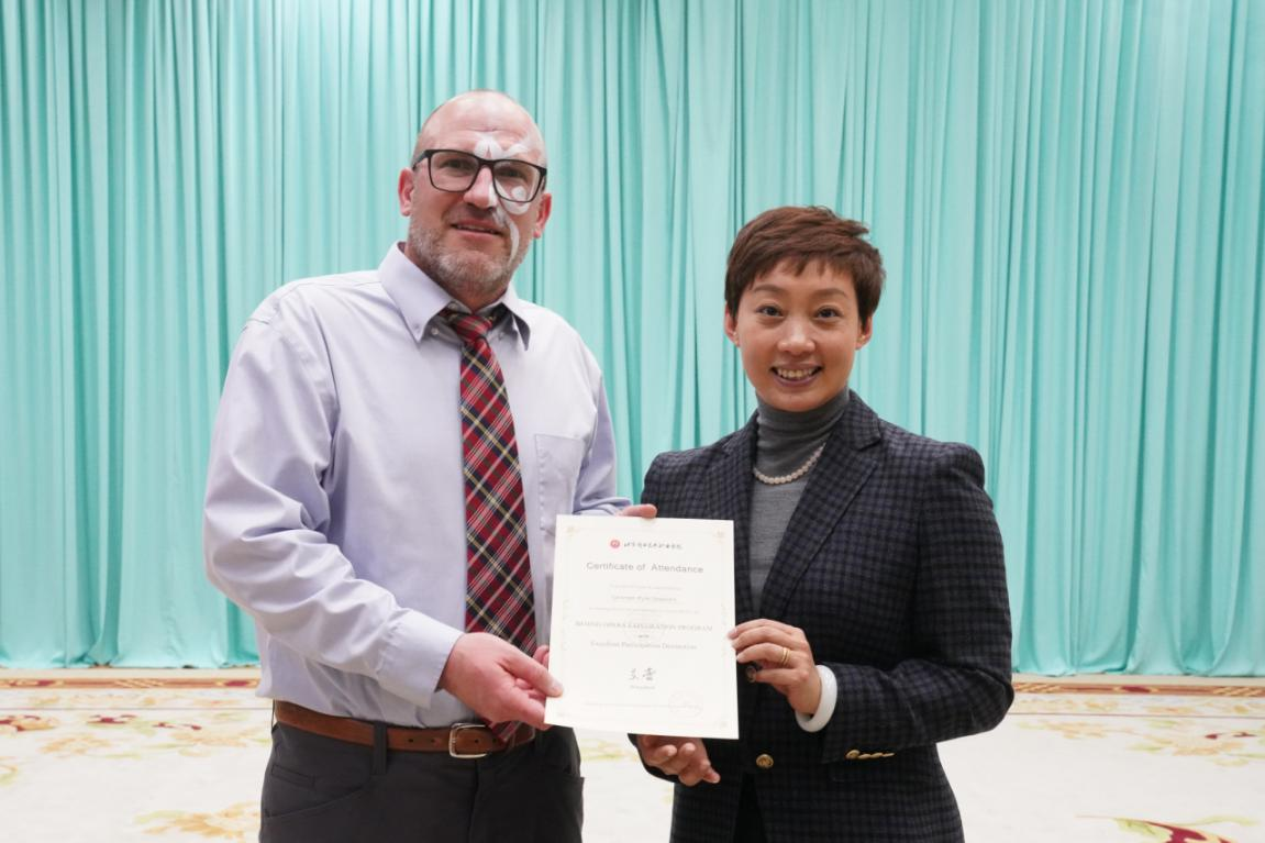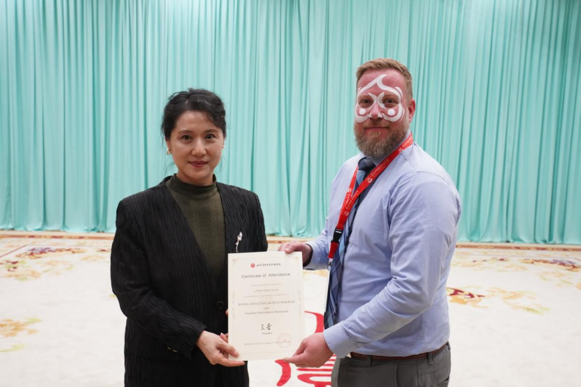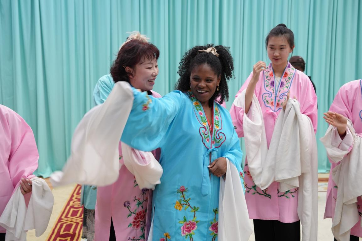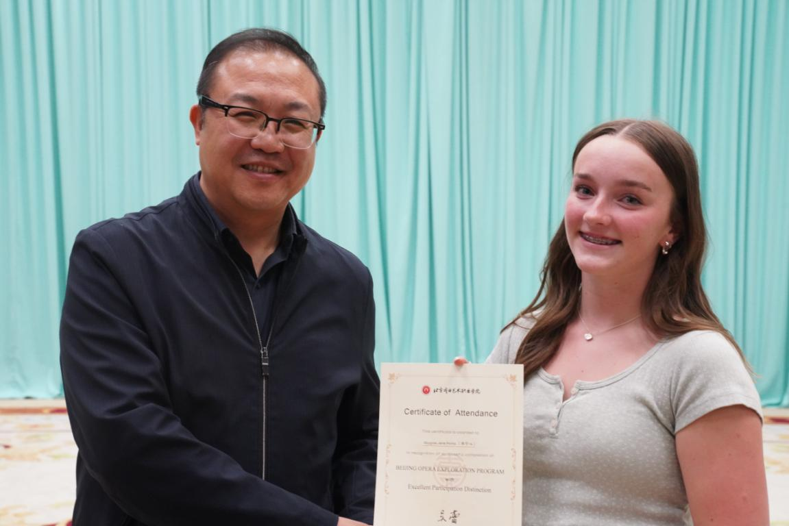 课堂观摩体验结束后,我院学生向美国友人赠送了精心制作的扇子、画作和非遗手工艺品“缠花”胸针,院长吴蕾、副院长许翠、副院长焦振宇分别为校长们颁发了戏曲文化探索印记证书。美国犹他州教育厅中文项目主任、校长团团长莲芯玫女士发言,对我院的热情接待致以衷心感谢,她指出,犹他州是全美开设汉语课程学校比例最高的州,很重视汉语和中国文化的学习,希望加强与北戏的友好交流,共同努力推动中美在教育文化领域的往来。