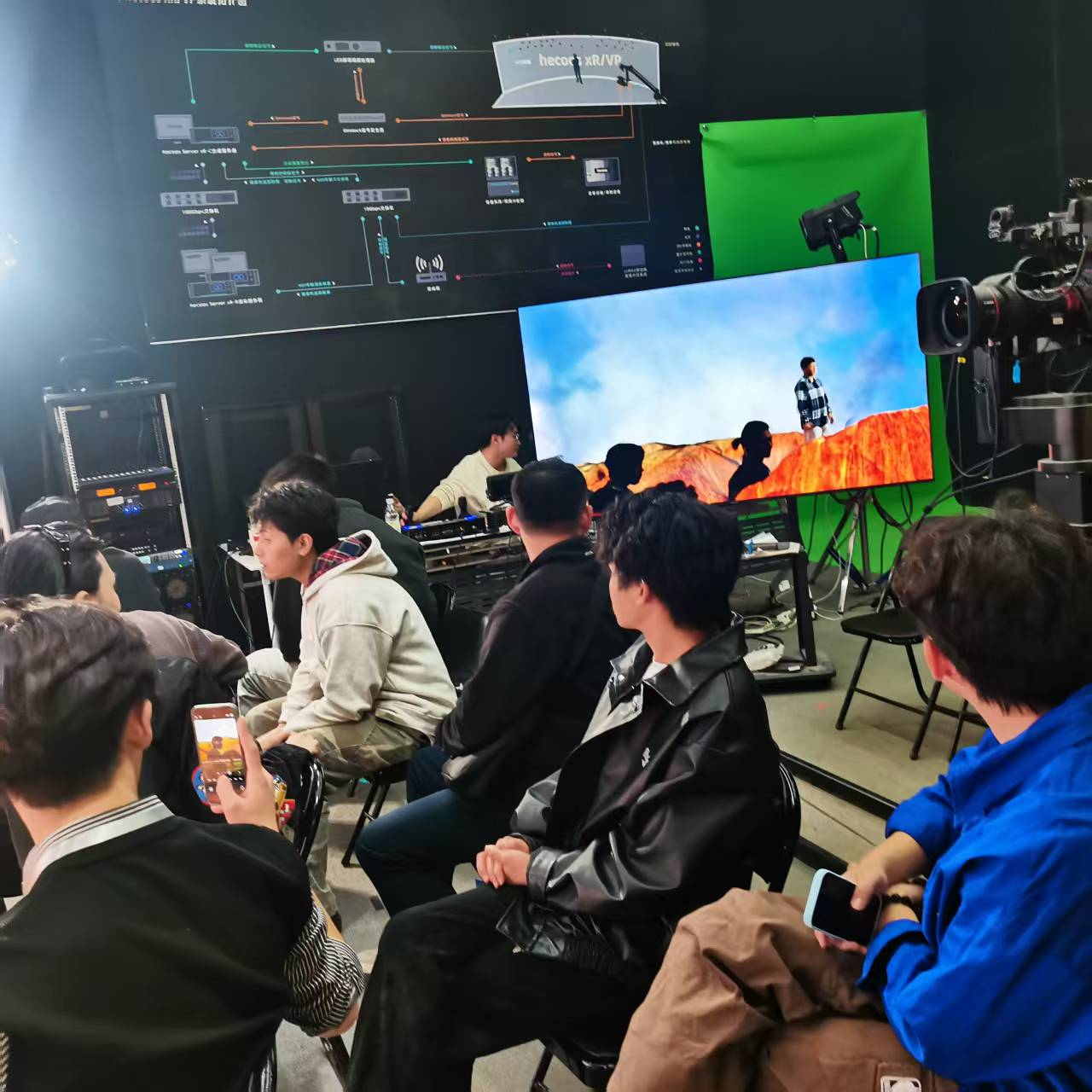 抵达深澜空间后,公司技术人员对XR虚拟演播室的核心原理、系统架构和前沿应用,进行了深入浅出的讲解。同学们第一次近距离接触到虚拟拍摄、实时渲染等前沿技术,真切感受到科技为影视和舞台制作带来的巨大变革。