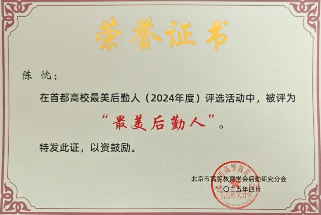 4月16日,北京市教委在北京科技大学召开2025年北京高校后勤工作会。会议表彰了2024年度首都高校最美后勤人和首都高校最美后勤团队,我院伙食管理处陈忱同志荣获“首都高校最美后勤人”称号。
