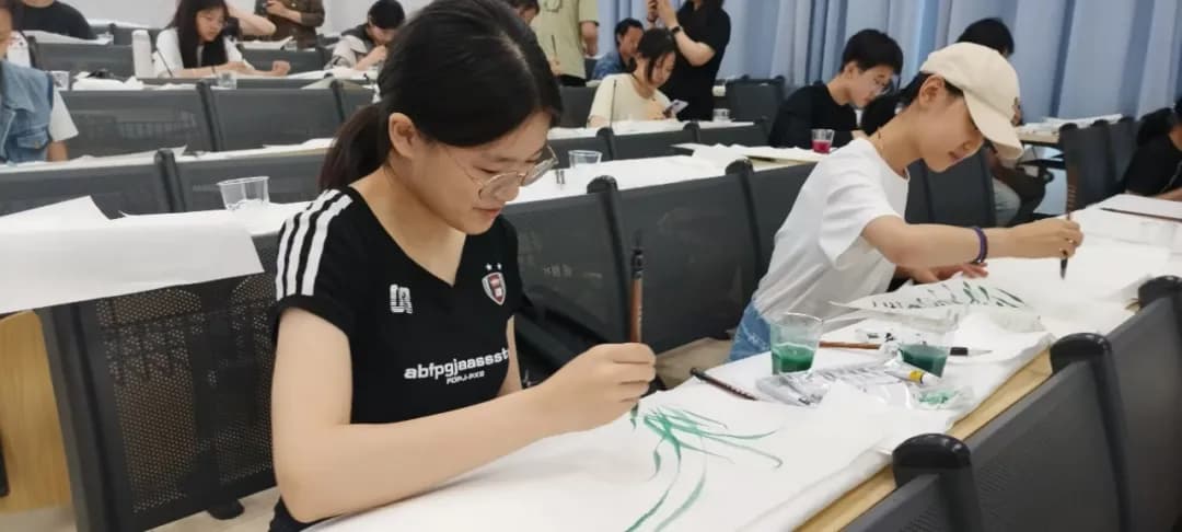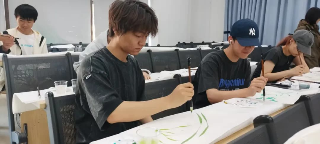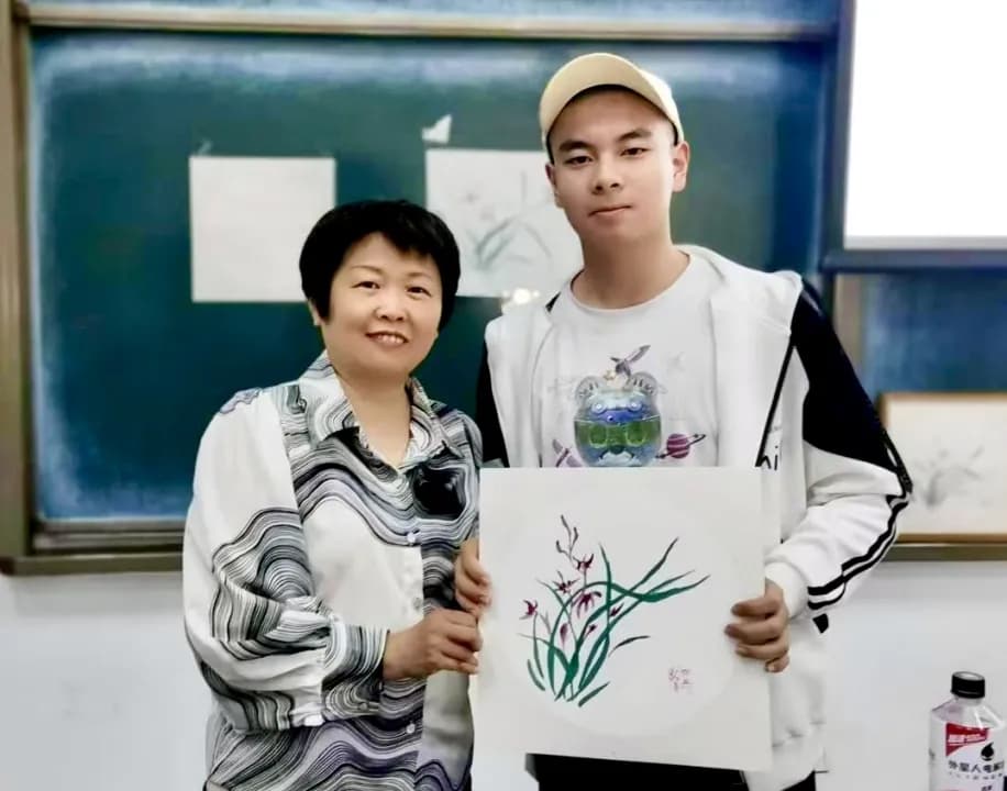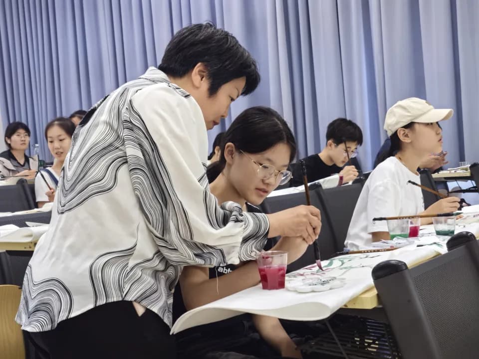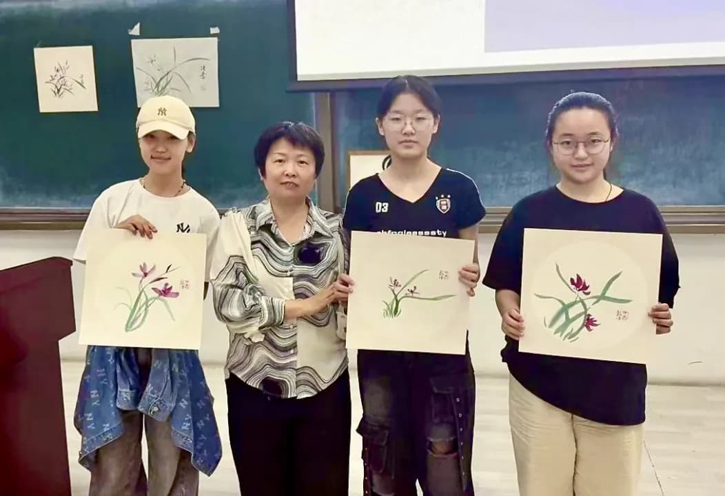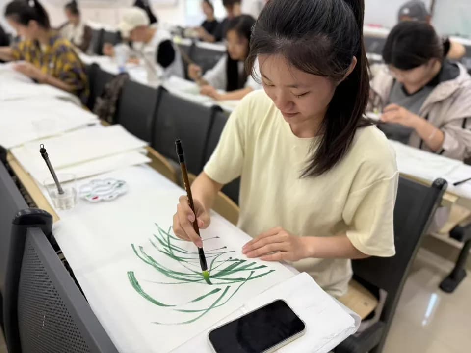 接下来张蕾老师讲到,春兰和惠兰是常见的两类兰花品种,春兰凭借优雅姿态与高洁品格,备受古人青睐。不同朝代画兰各有千秋,宋代画兰注重细节,力求逼真还原;明代流行大幅卷轴画兰,徐徐展开间可细细品味,且常以墨色勾勒兰的神韵;清代画兰会融入竹石元素,借景抒情。到了近现代,齐白石的画兰之法独树一帜,工笔与写意融合,动静相得益彰。在传授画兰技巧环节,张蕾老师从笔法运用到兰花形态塑造,再到花心点缀,像怎么画出螳螂肚、交凤眼,如何用“山”“心”之法点蕊,并对每位在场同学进行了一对一指导。