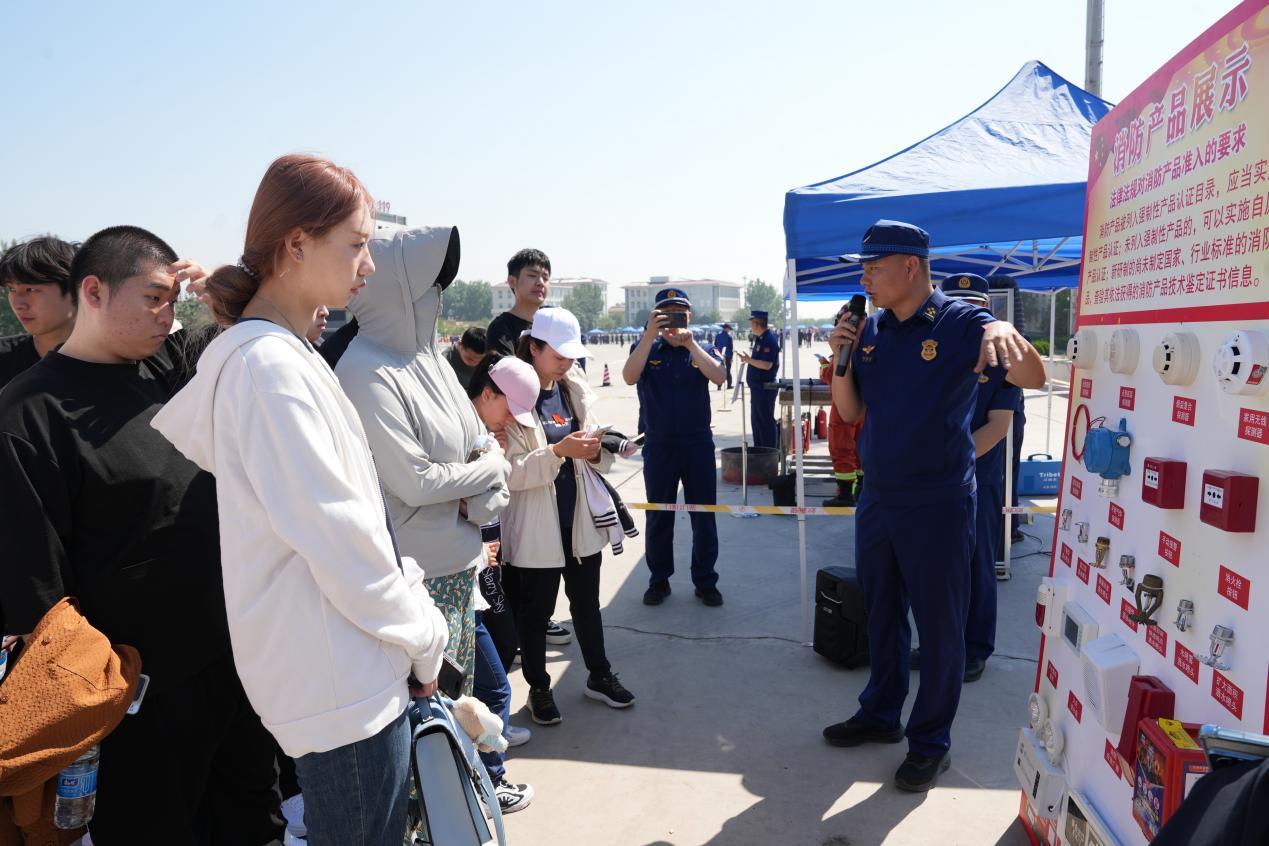 同学在认真聆听,讲解员介绍各类消防设施设备。