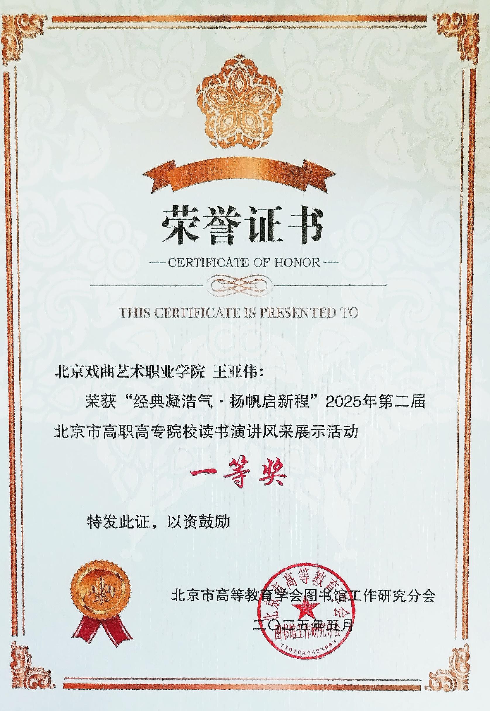 比赛中,来自13所职业院校的21名参赛选手紧扣“经典凝浩气,扬帆启新程”的主题,用生动的语言与真挚的情感展现出对知识的热爱和对真理的追求。我院曲艺系学生王亚伟在比赛中以其饱满的热情和精湛的诵读技巧,充分展现我院学生良好的精神风貌和深厚的家国情怀,喜获一等奖。我院教师张怡获优秀指导教师奖,我院图书信息中心获优秀组织奖。
