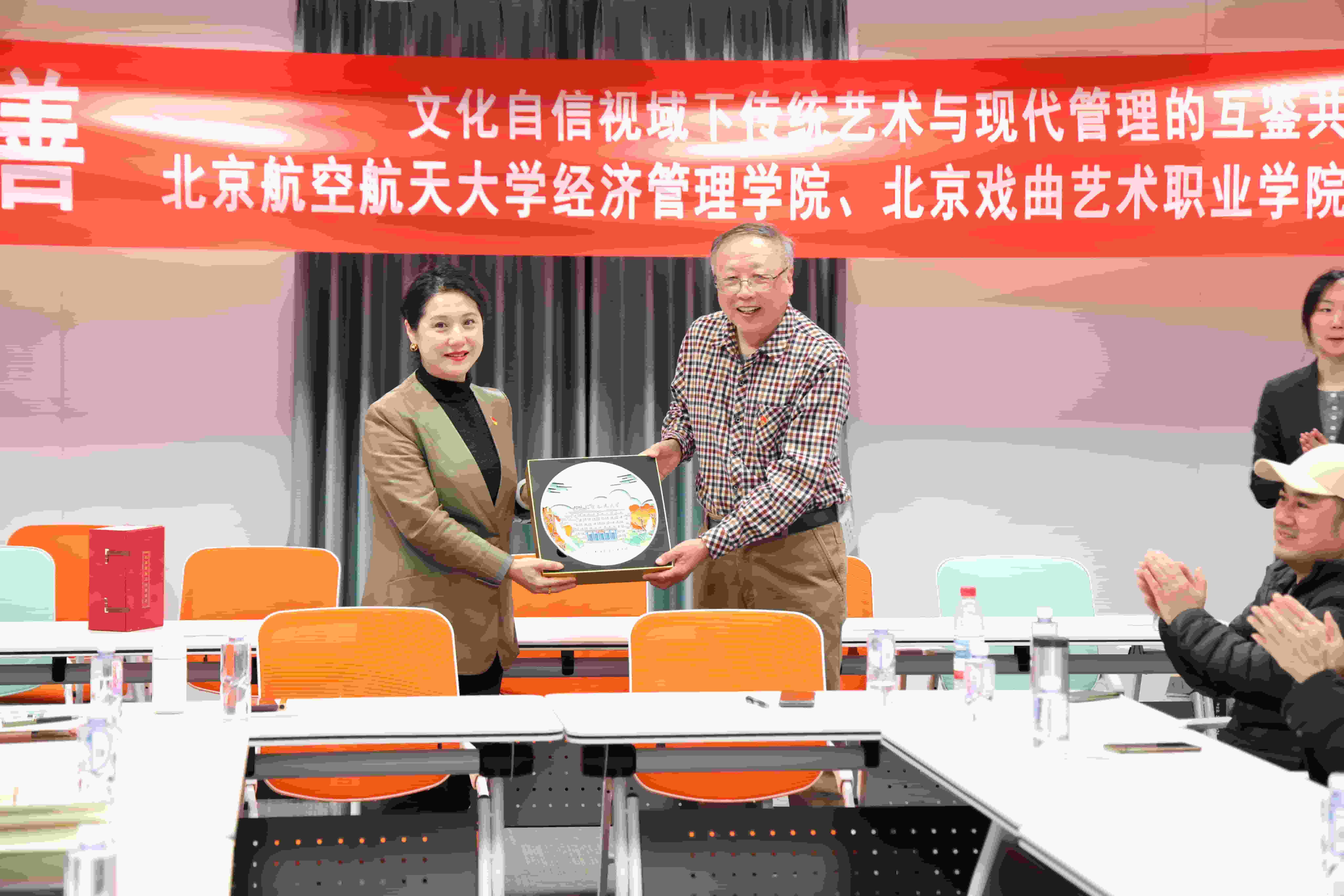 活动的最后,经管学院陈向东教授向北戏赠送刻有北航老主楼的文创瓷盘,北戏副院长许翠向经管学院赠送由北戏艺术研究中心出版的《红豆馆拍正词曲遗存》。两校师生均表示,期待以后开展更深入的交流活动。