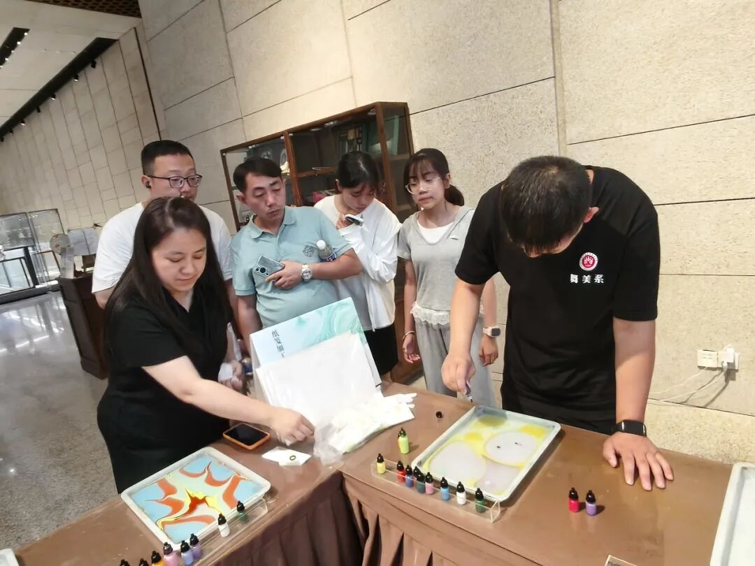 实践团在中国工艺美术馆与非遗馆开启“美学研学”之旅。龙泉青瓷的温润釉色、北京点翠的精致灵动等非遗展品,生动展现着中华美学的深厚底蕴。成员们还亲手参与流沙笺团扇制作,在笔墨流淌中感受传统技艺的细腻;围观锡雕艺人的现场演示,于一刀一凿中体会“工匠精神”的执着。在“看、学、做”的互动中,深化了对非遗文化传承不易与坚守可贵的认知。